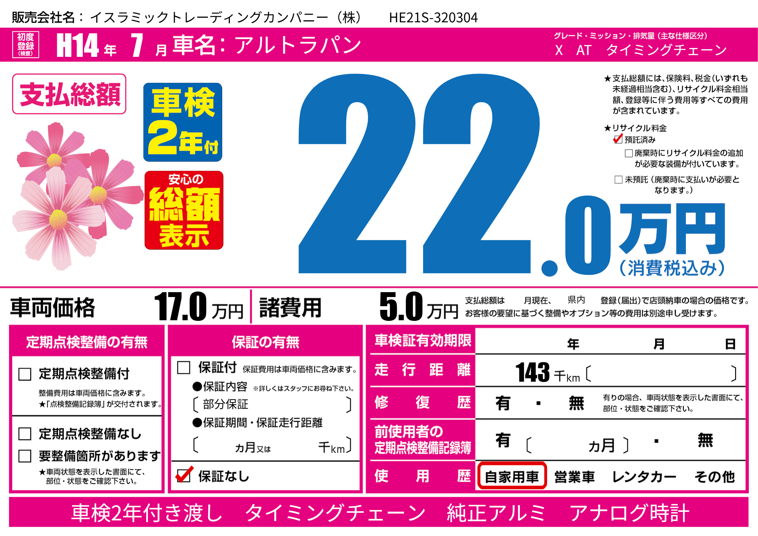 | 走行キロ | 14.3万km | 初年度登録 | H14年7月 |