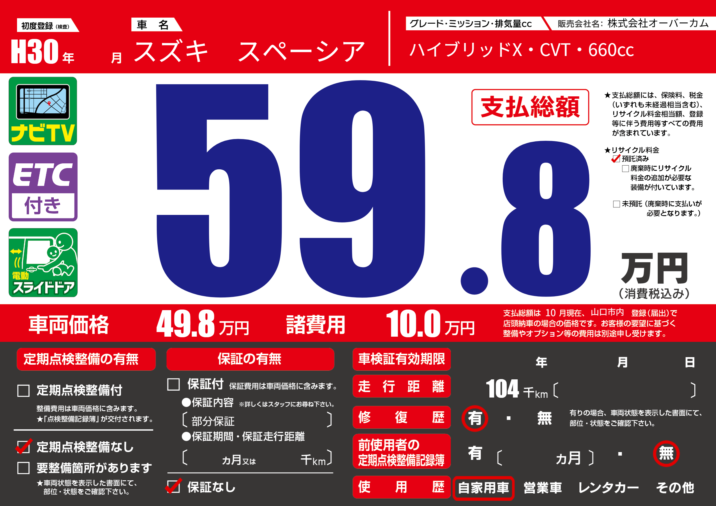 | 走行キロ | 10.4万km | 初年度登録 | H30年---月 |