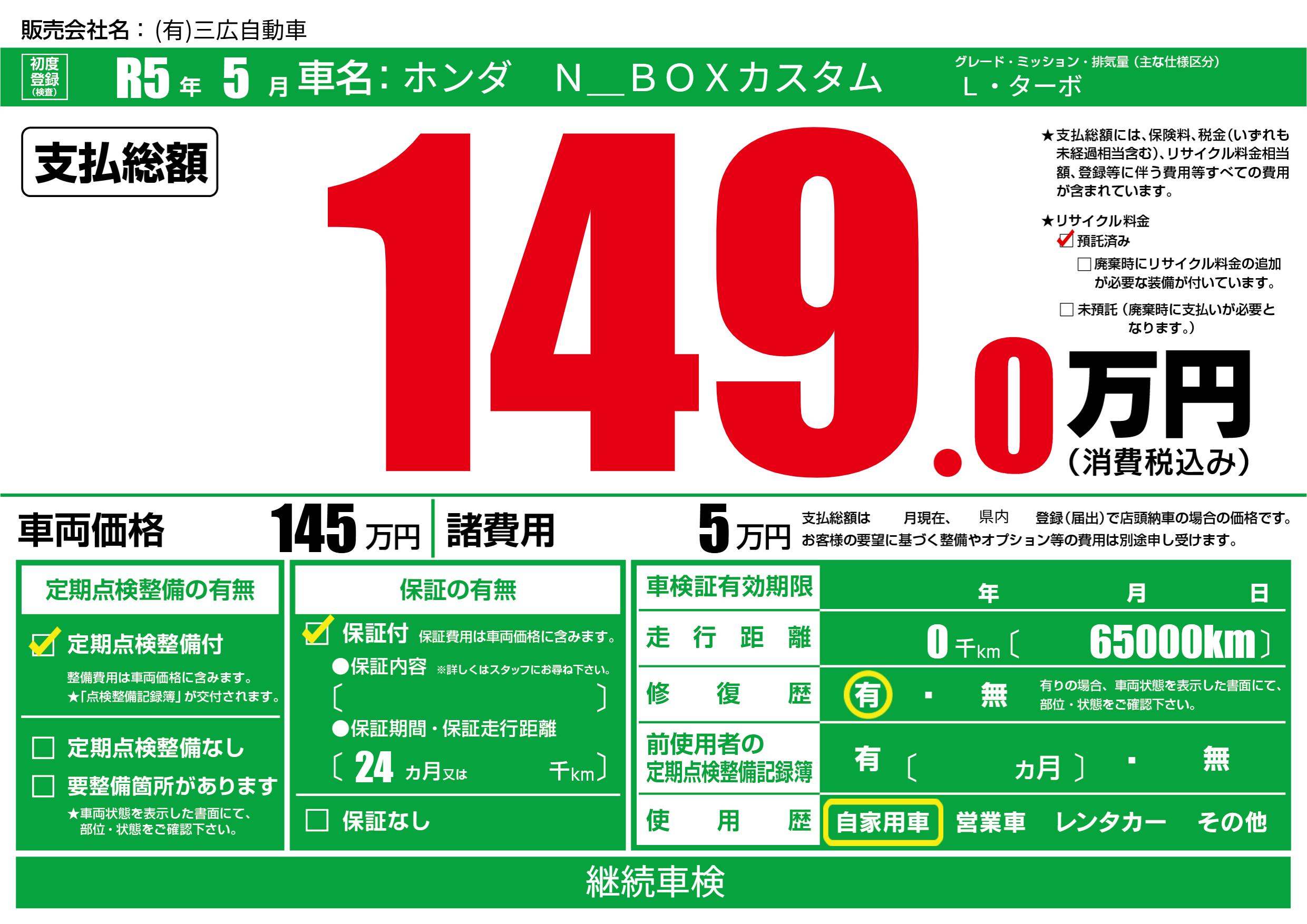 保証付き 保証内容(---) 24ヶ月または()千kmまで |