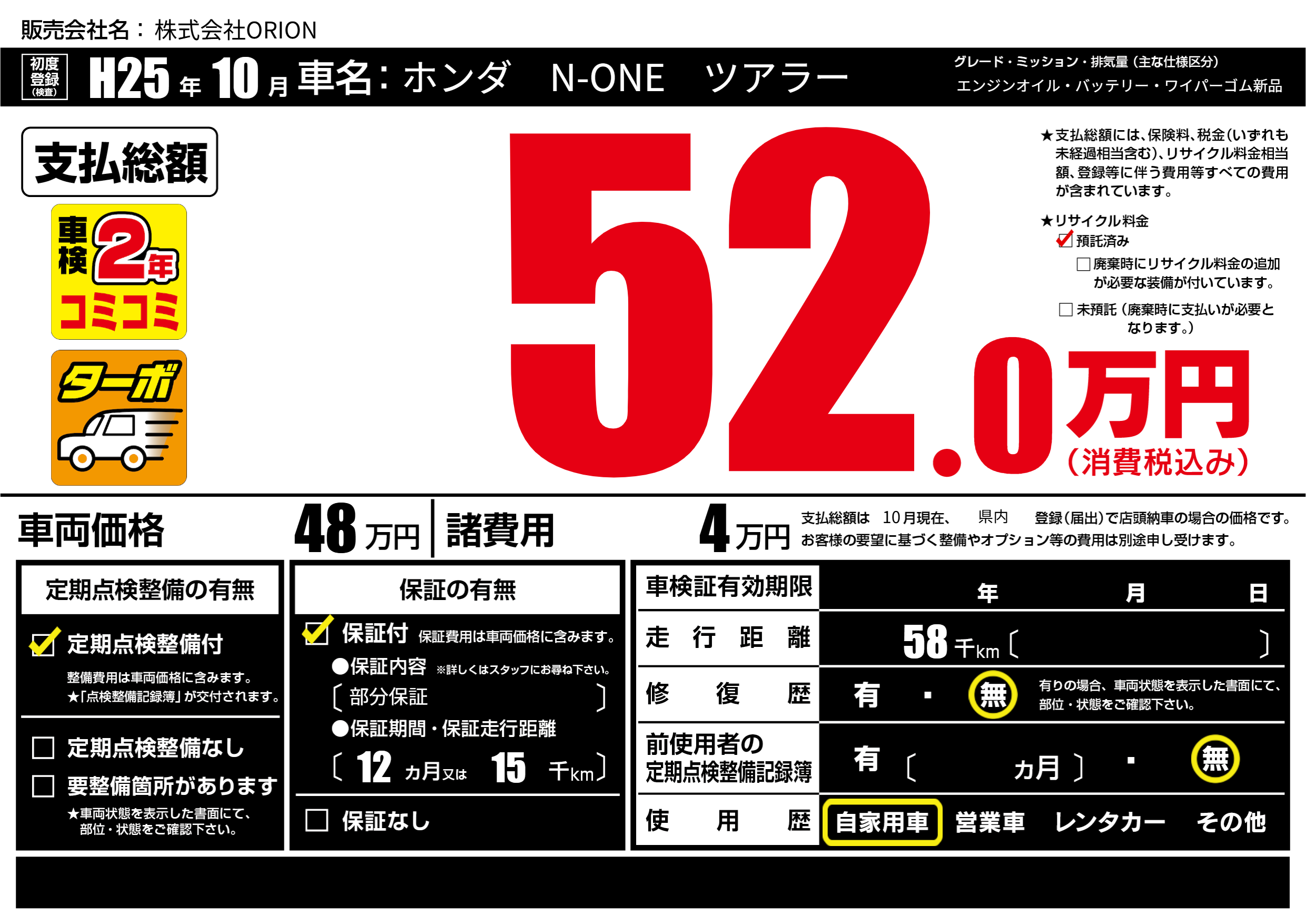 | 車名 | ホンダ N-ONE ツアラー | グレード ミッション 排気量 |