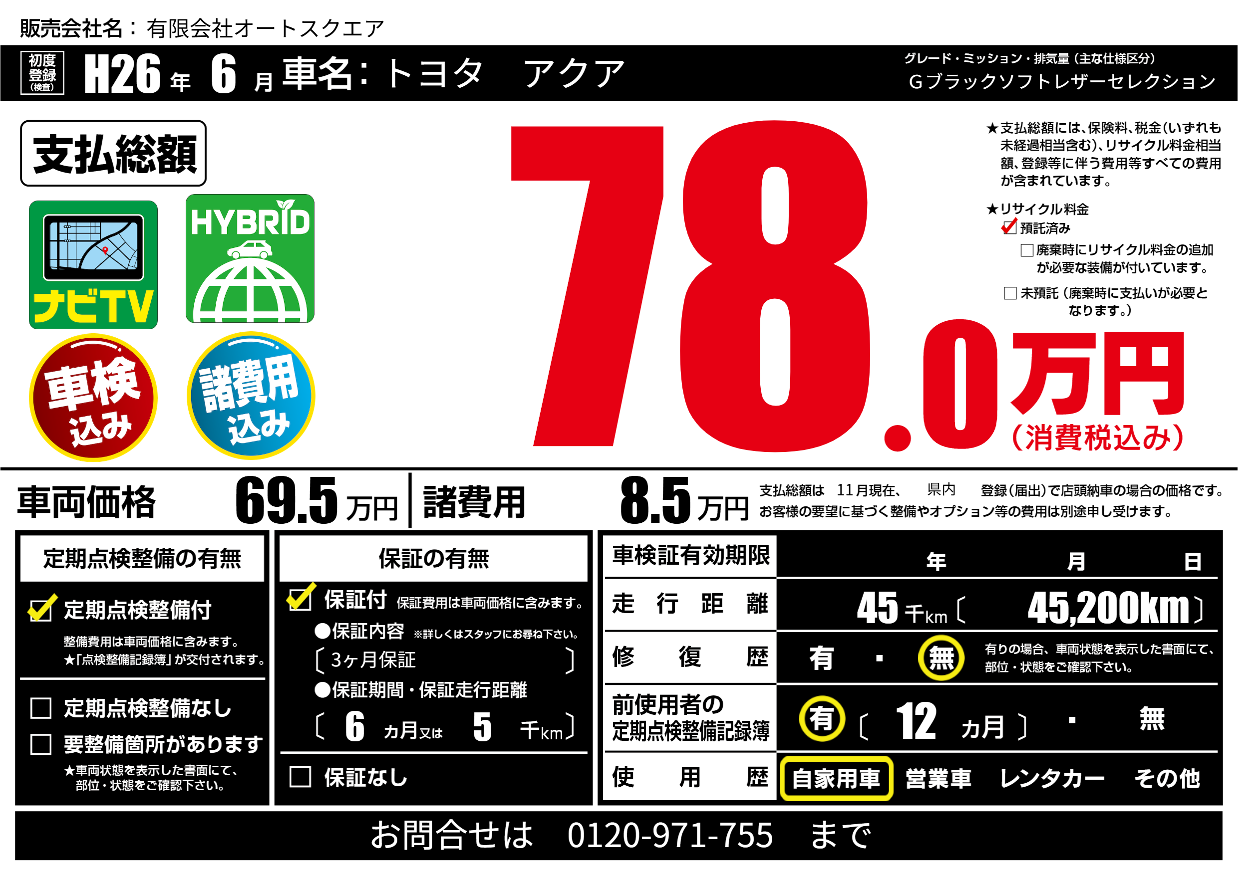 | 車名 | トヨタ アクア | グレード ミッション 排気量 |