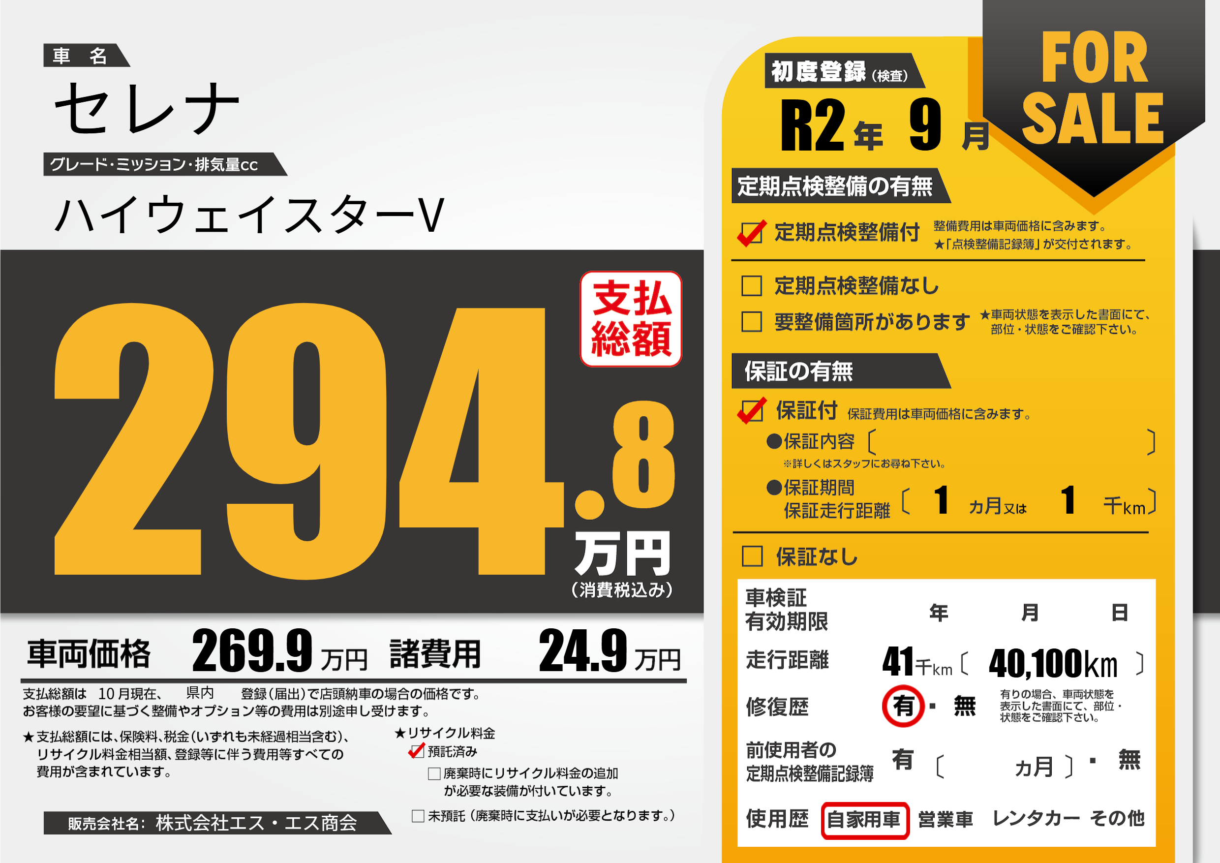 | 走行キロ | 4.1万km | 初年度登録 | R2年9月 |