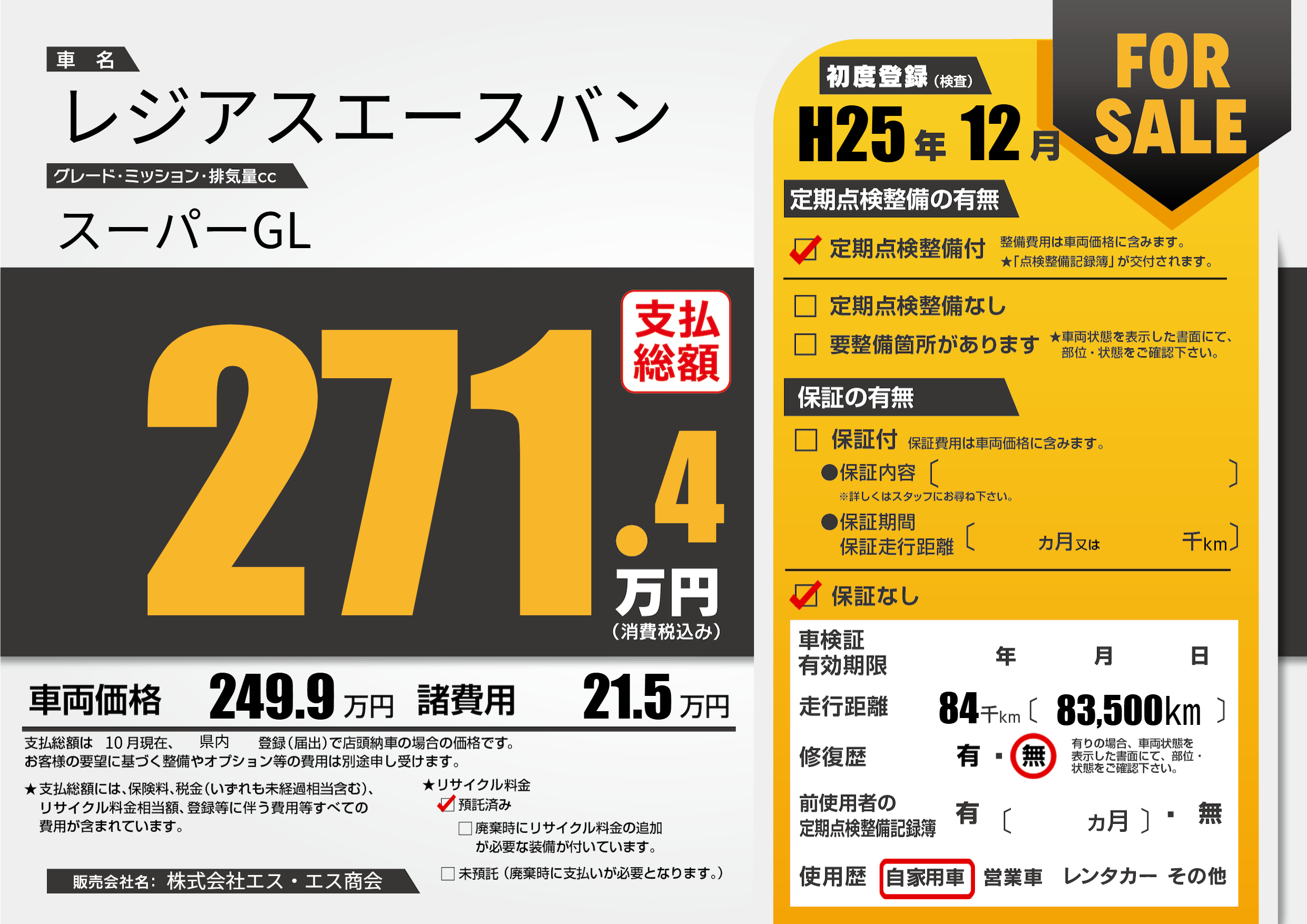 | 走行キロ | 8.4万km | 初年度登録 | H25年12月 |
