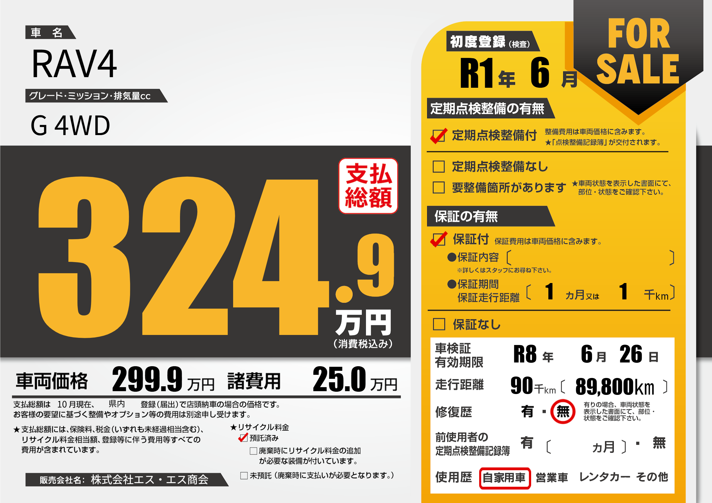 | 走行キロ | 9万km | 初年度登録 | R1年6月 |