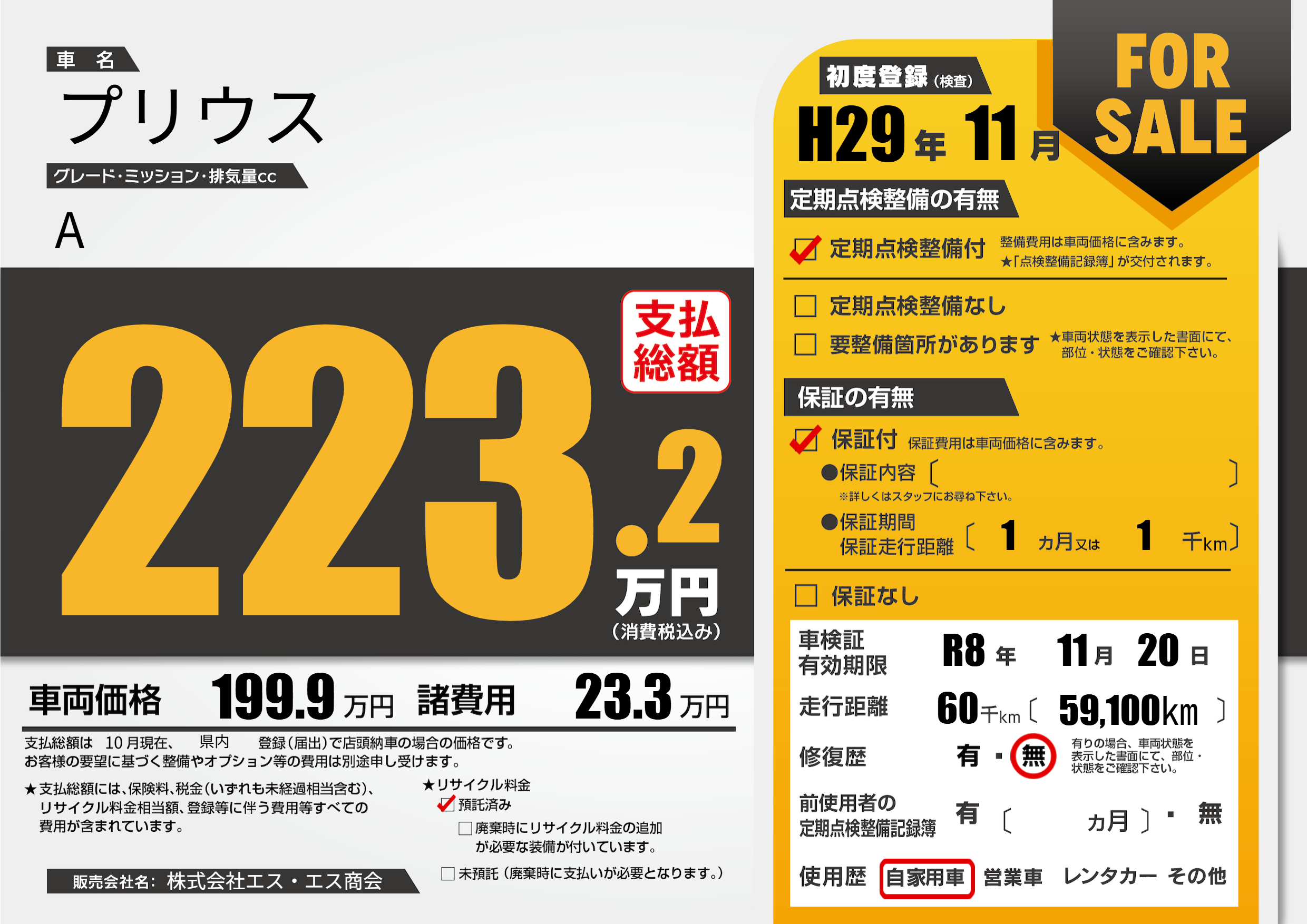 | 車名 | プリウス | グレード ミッション 排気量 |