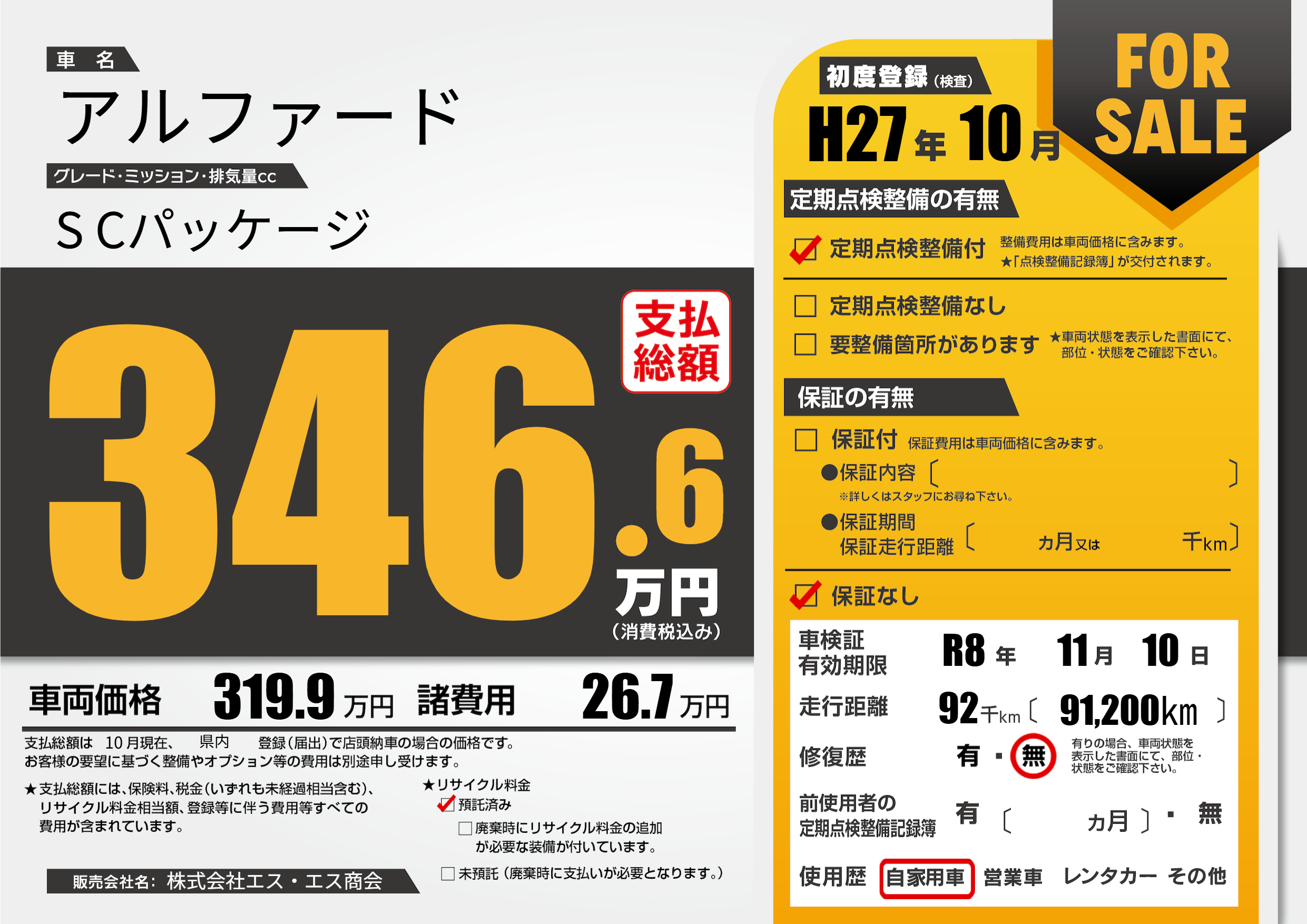 | 走行キロ | 9.2万km | 初年度登録 | H27年10月 |