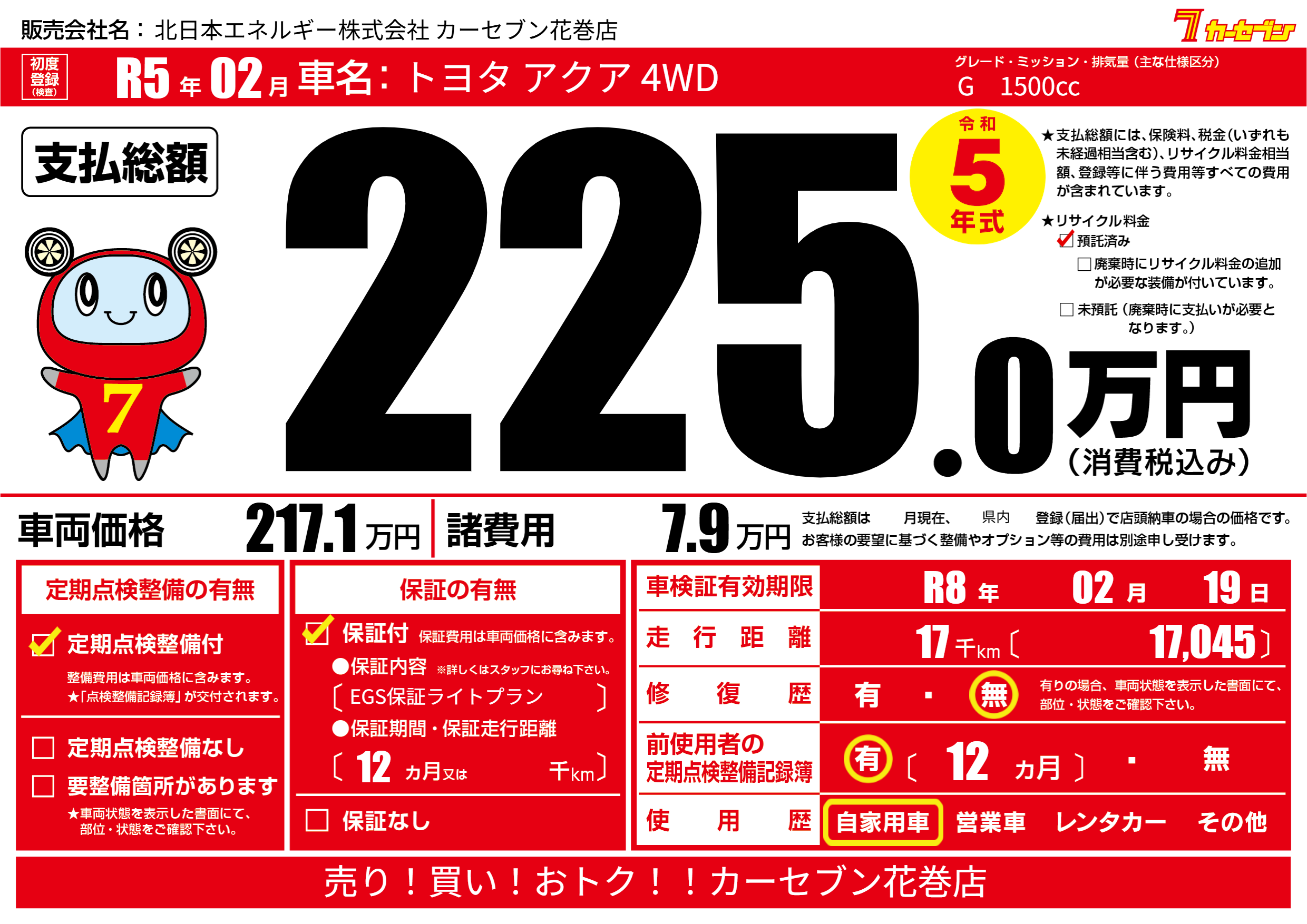 | 走行キロ | 1.7万km | 初年度登録 | R5年02月 |