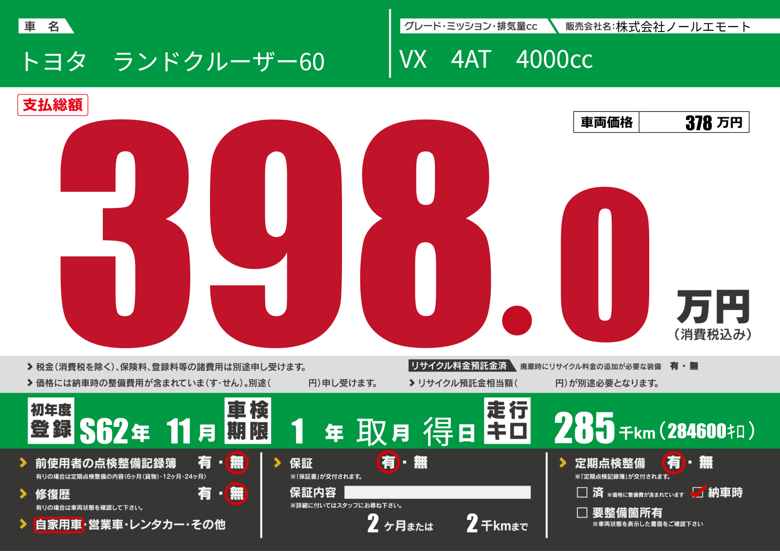 | 車名 | トヨタ ランドクルーザー60 | グレード ミッション 排気量 |
