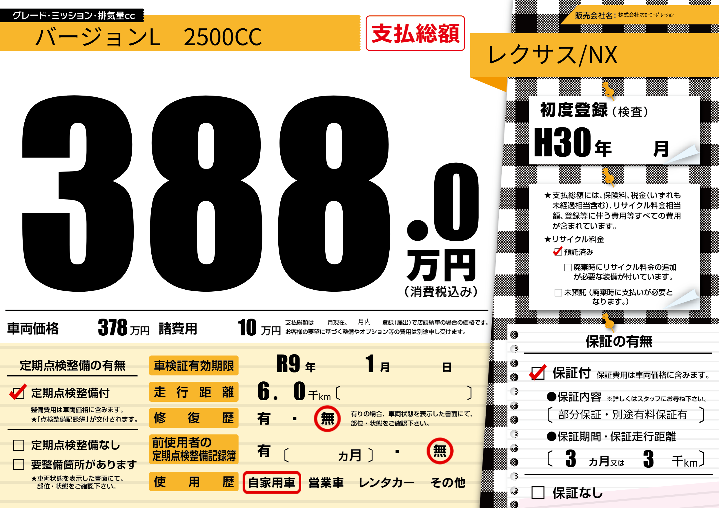 | 車名 | レクサス/NX | グレード ミッション 排気量 |