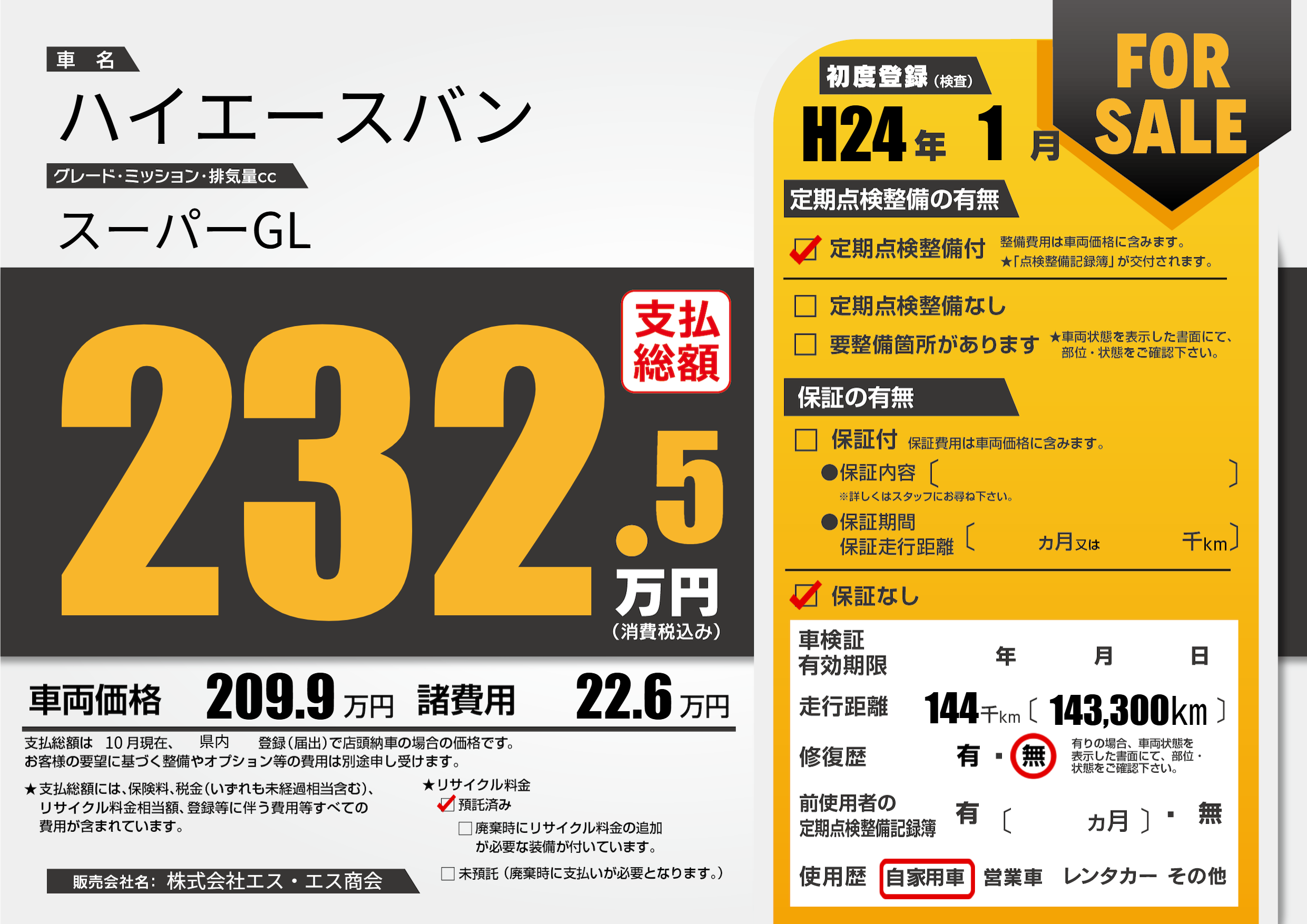| 車名 | ハイエースバン | グレード ミッション 排気量 |
