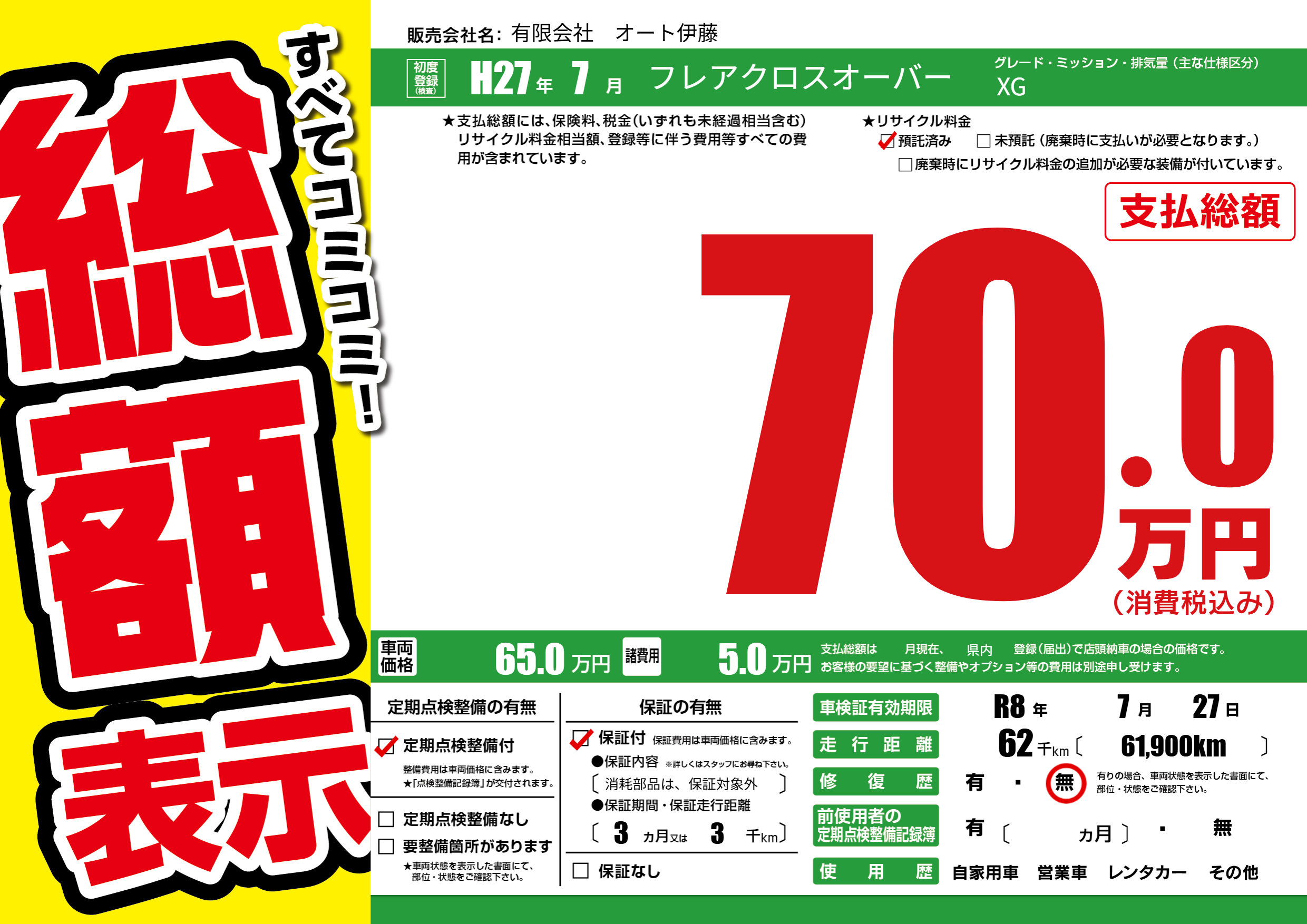 | 車名 | フレアクロスオーバー | グレード ミッション 排気量 |
