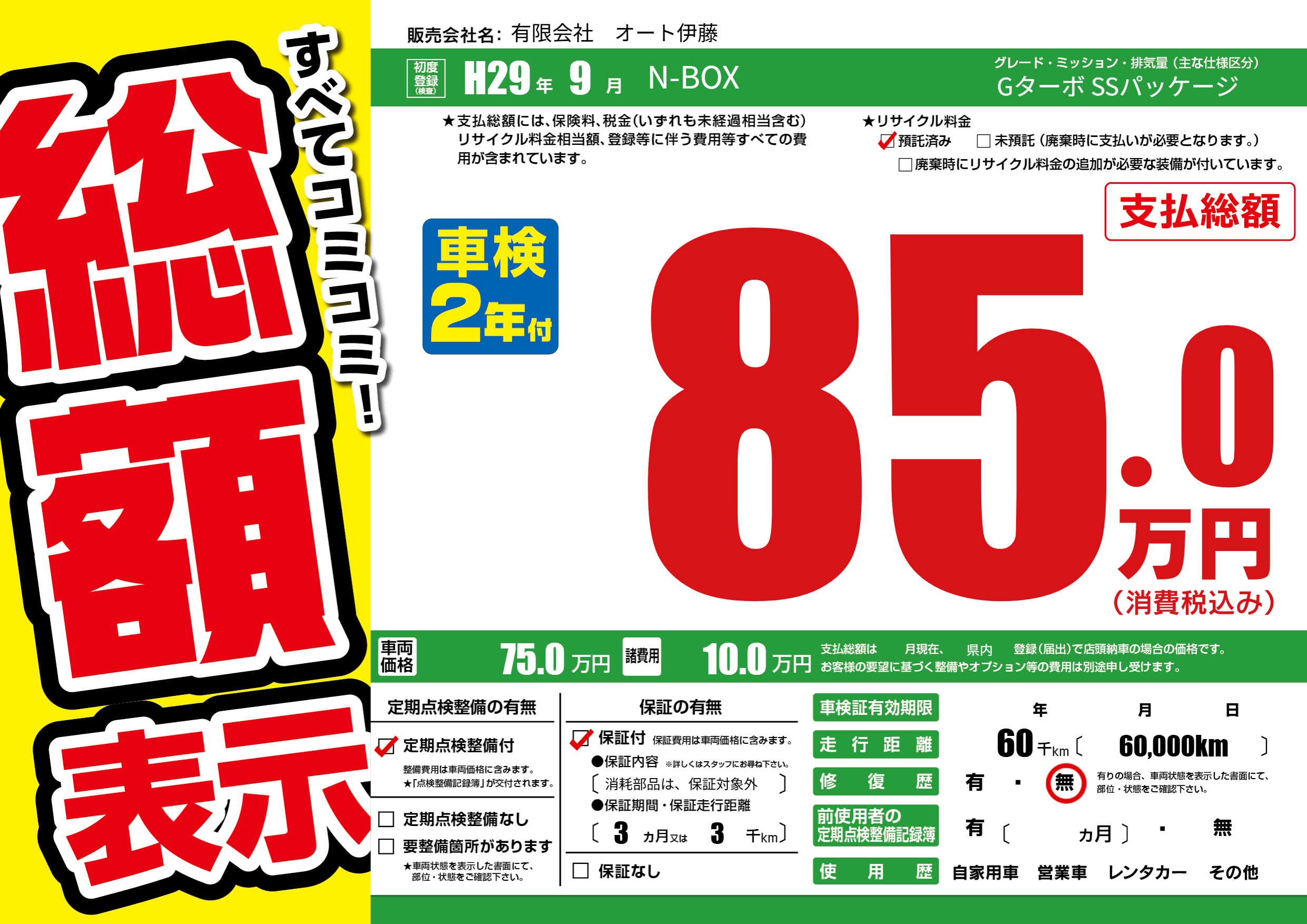 | 車名 | N-BOX | グレード ミッション 排気量 |