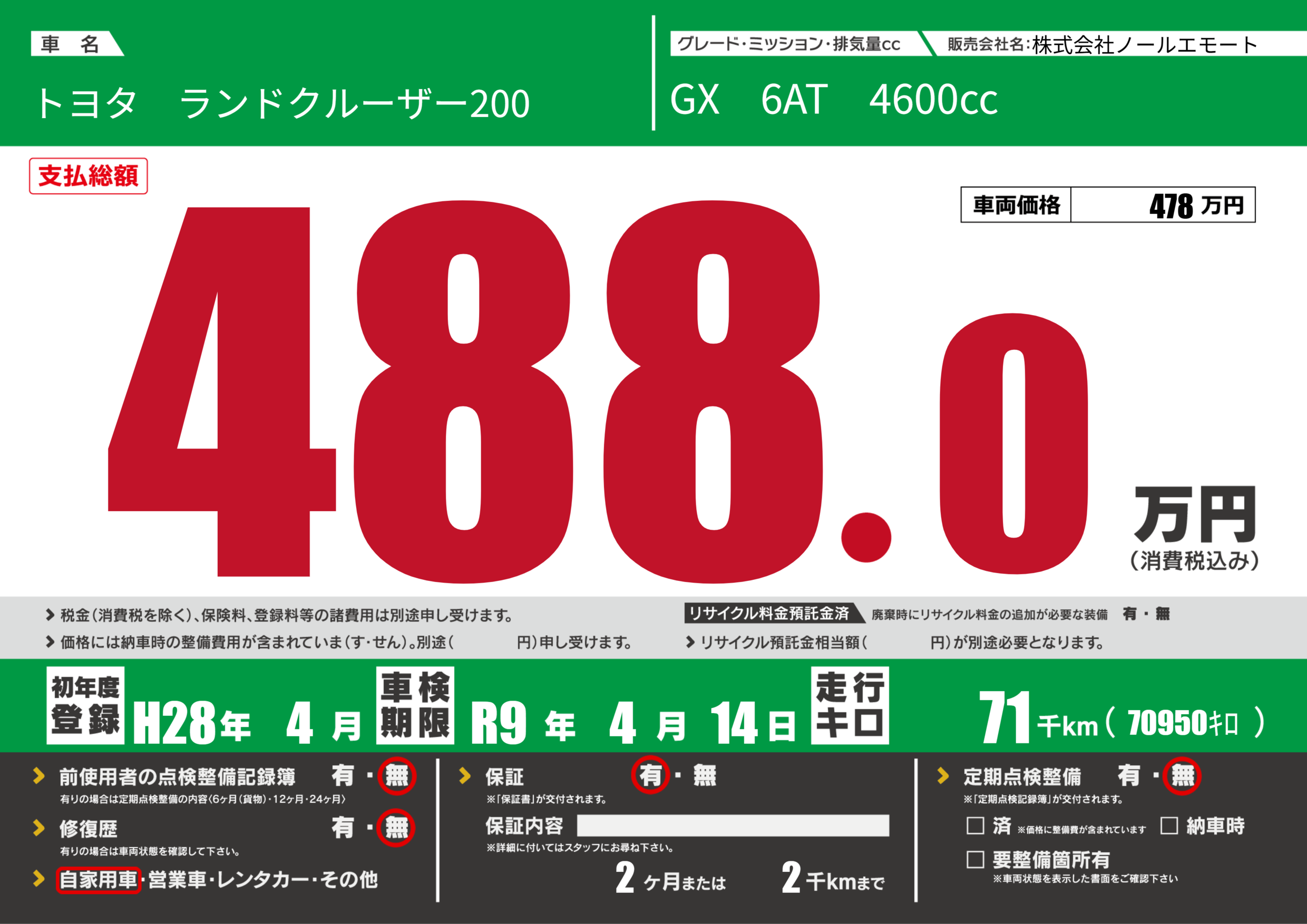 | 車名 | トヨタ ランドクルーザー200 | グレード ミッション 排気量 |