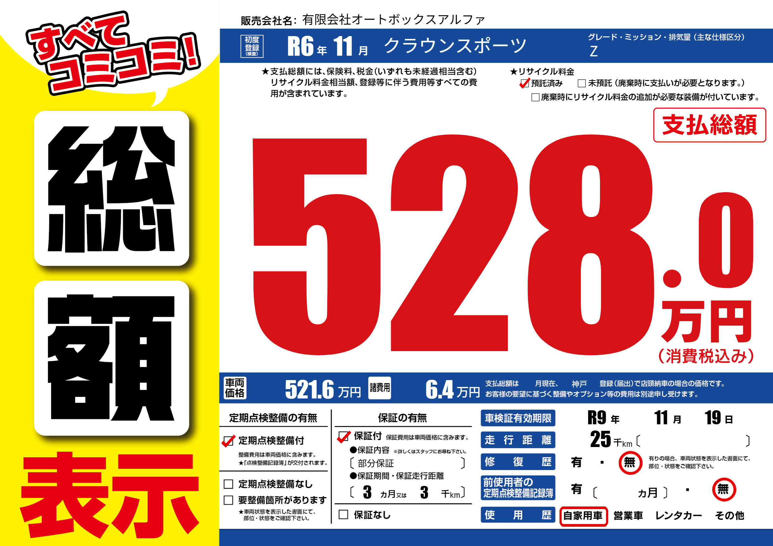 | 車名 | クラウンスポーツ | グレード ミッション 排気量 |