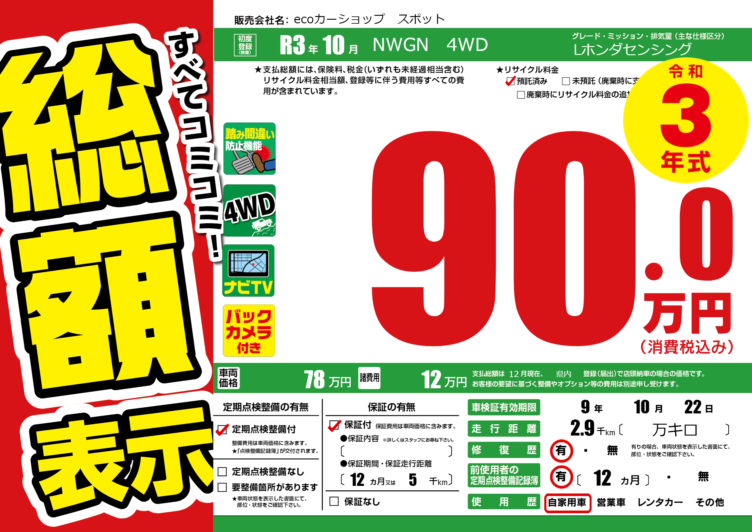 | 車名 | NWGN 4WD | グレード ミッション 排気量 |