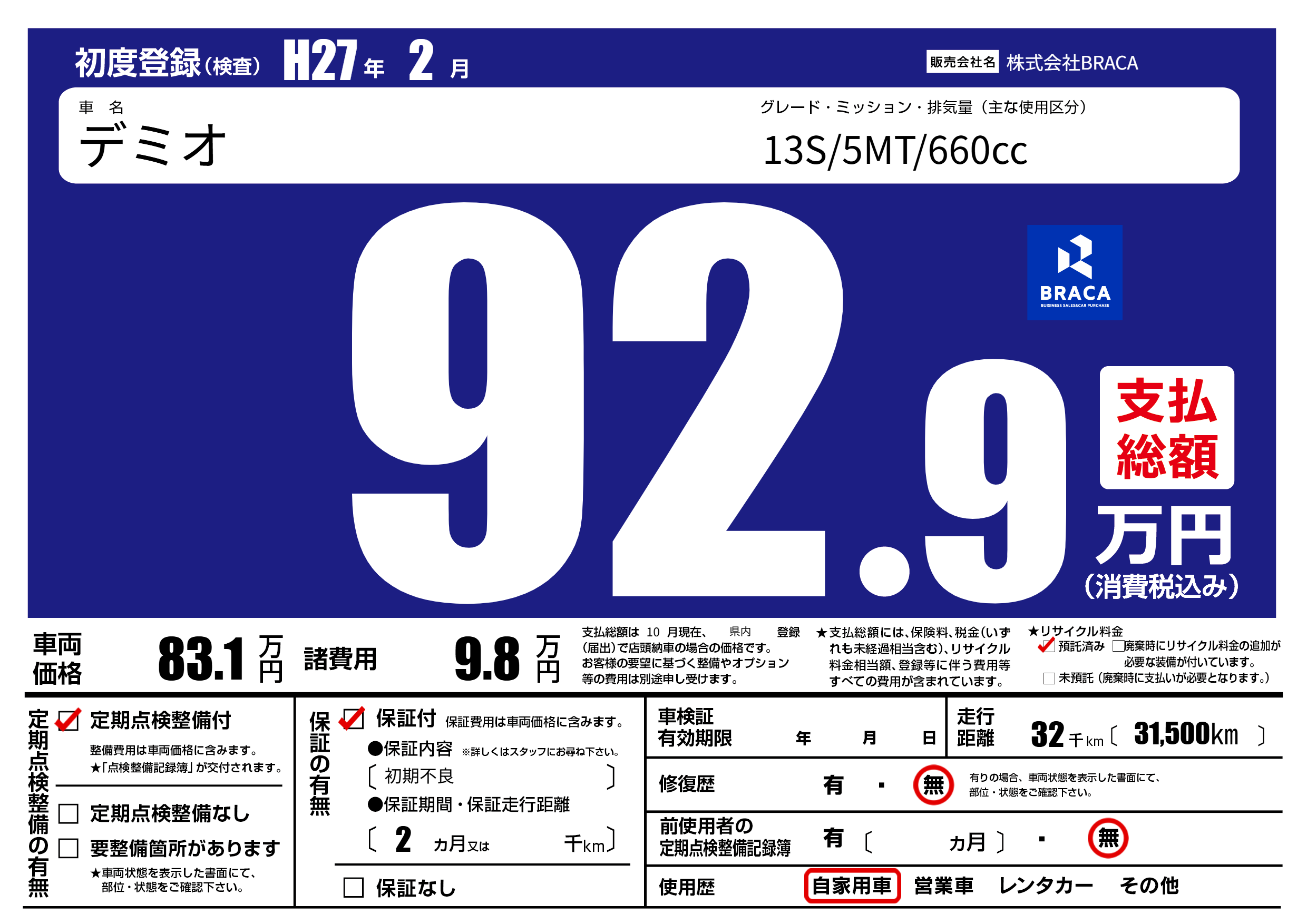 | 初年度登録 | H27年2月 | ||