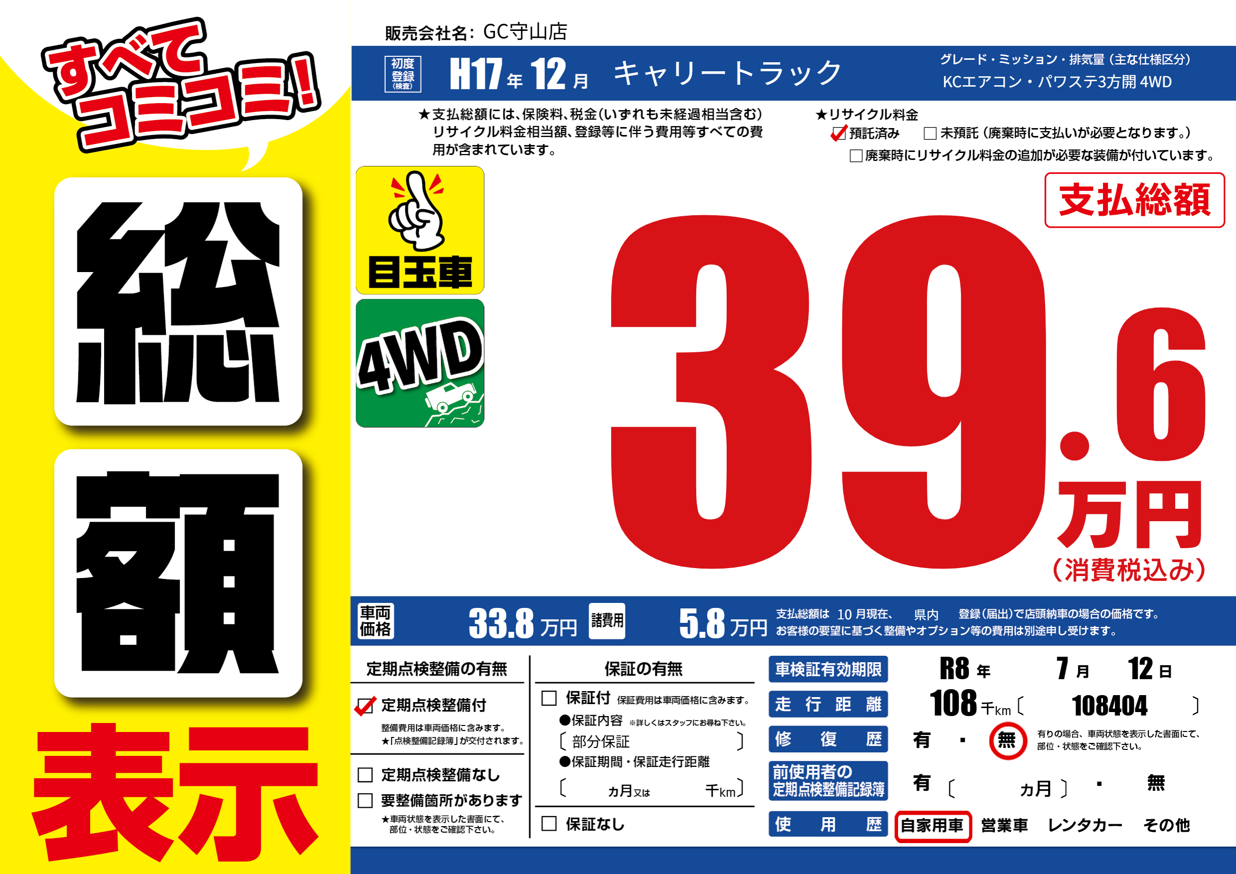| 走行キロ | 10.8万km | 初年度登録 | H17年12月 |