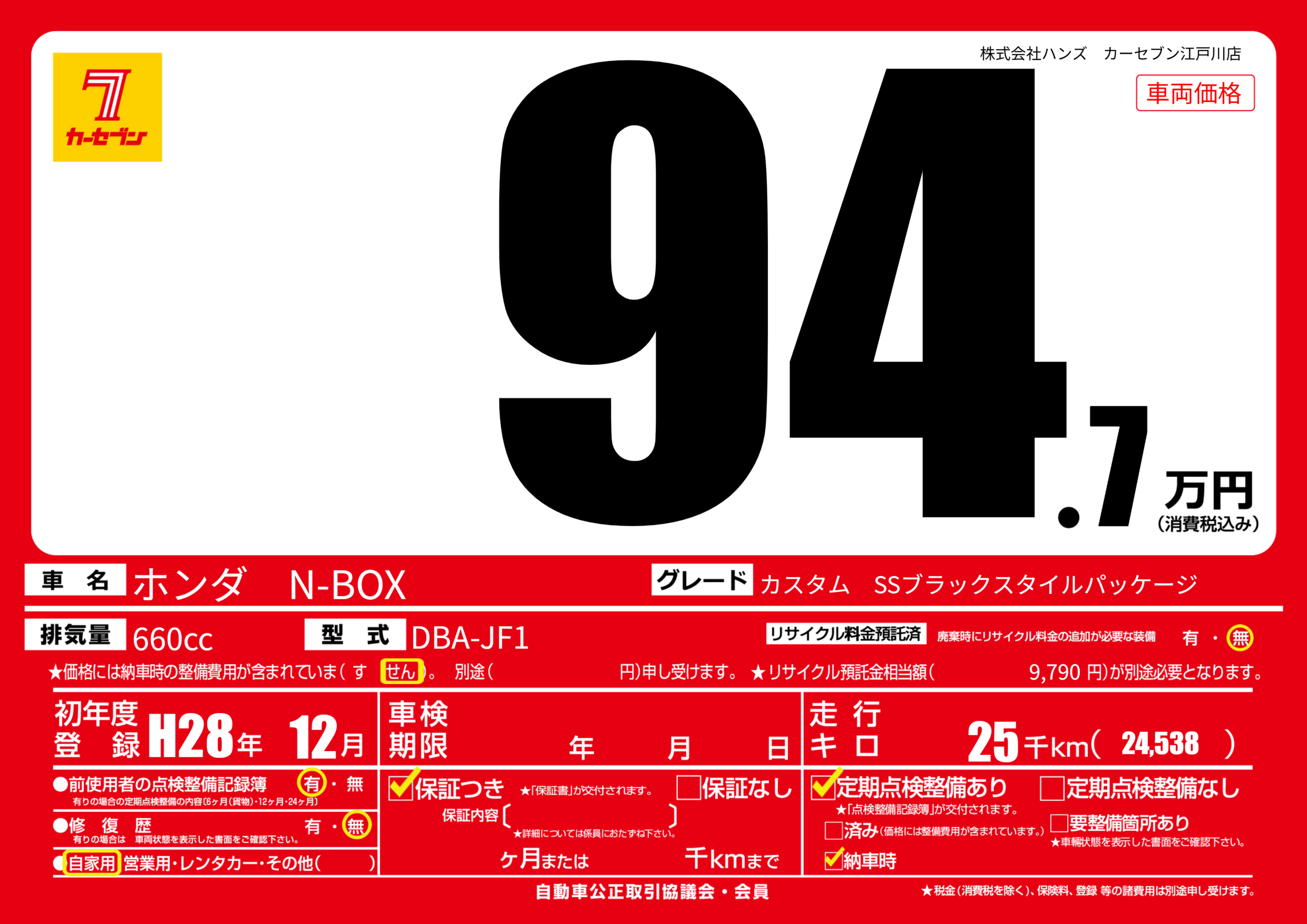 | 車名 | ホンダ N-BOX | グレード ミッション 排気量 |