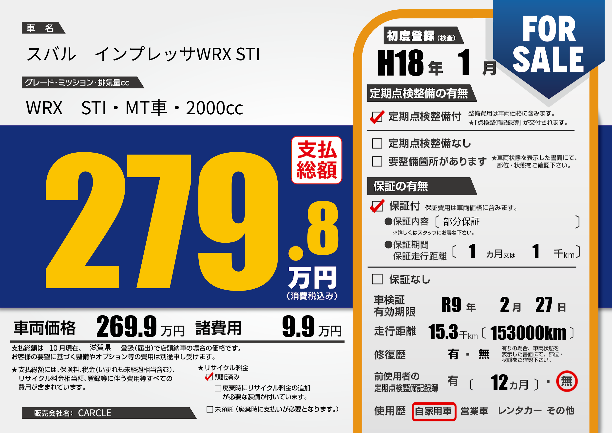 | 車名 | スバル インプレッサWRX STI | グレード ミッション 排気量 |