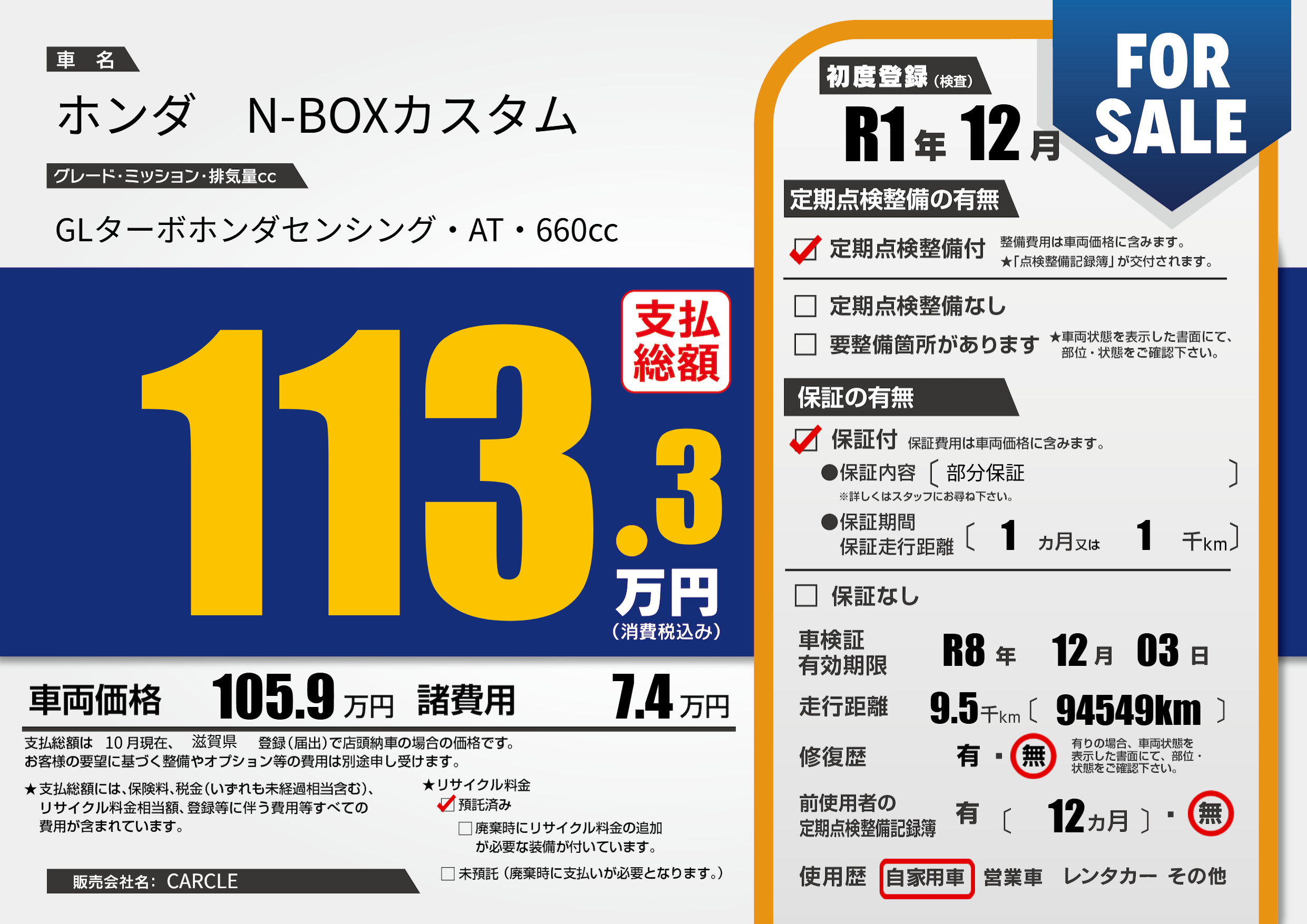 | 走行キロ | 0.9万km | 初年度登録 | R1年12月 |