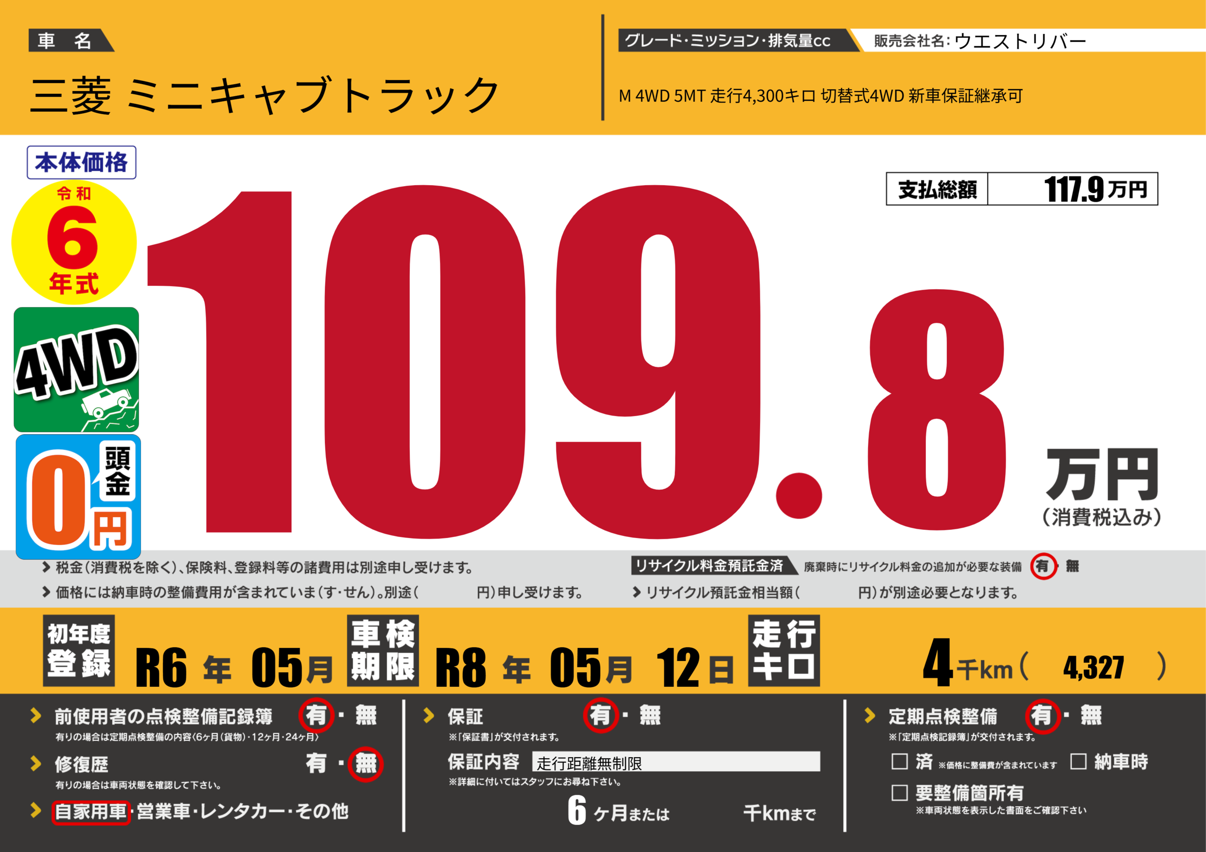 M 4WD 5MT 走行4,300キロ 切替式4WD 新車保証継承可 |