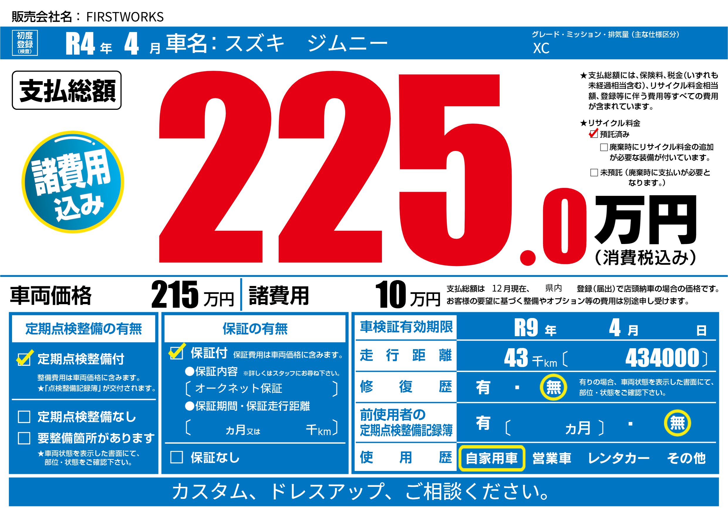 | 走行キロ | 4.3万km | 初年度登録 | R4年4月 |