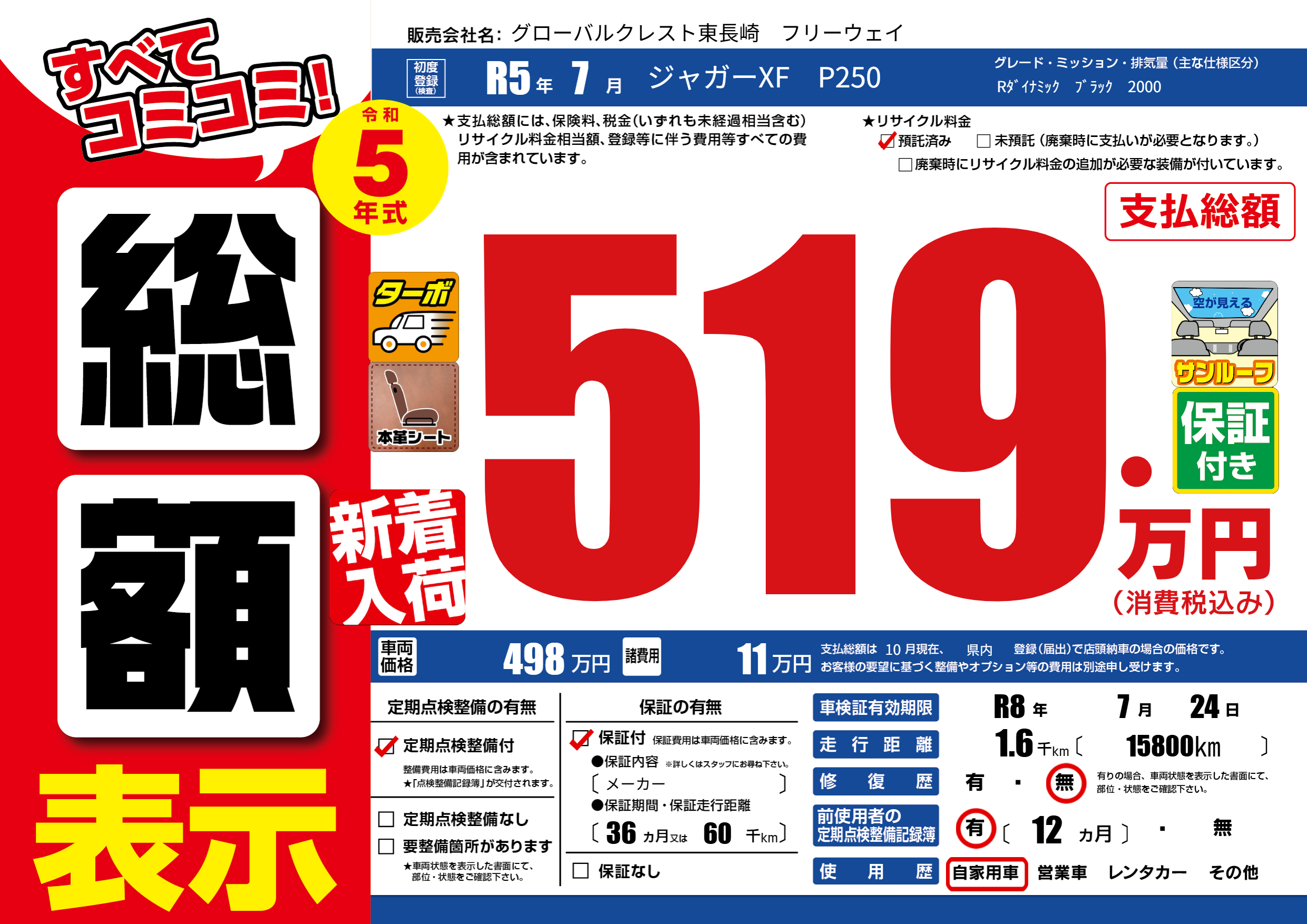 | 車名 | ジャガーXF P250 | グレード ミッション 排気量 |