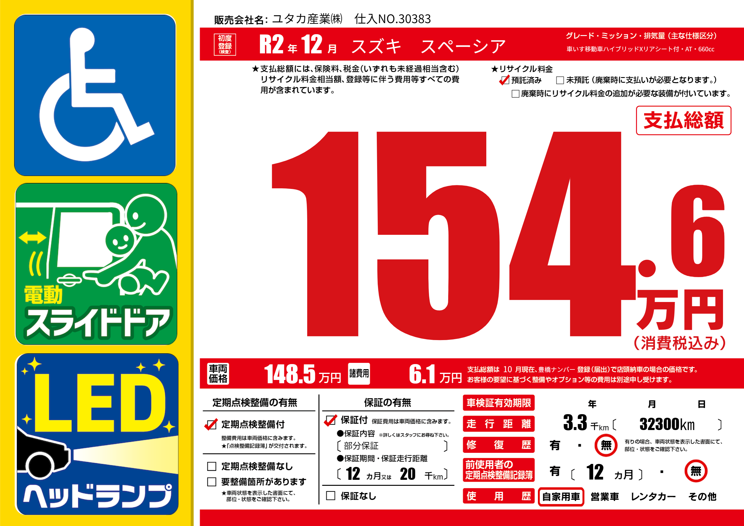 | 走行キロ | 0.3万km | 初年度登録 | R2年12月 |