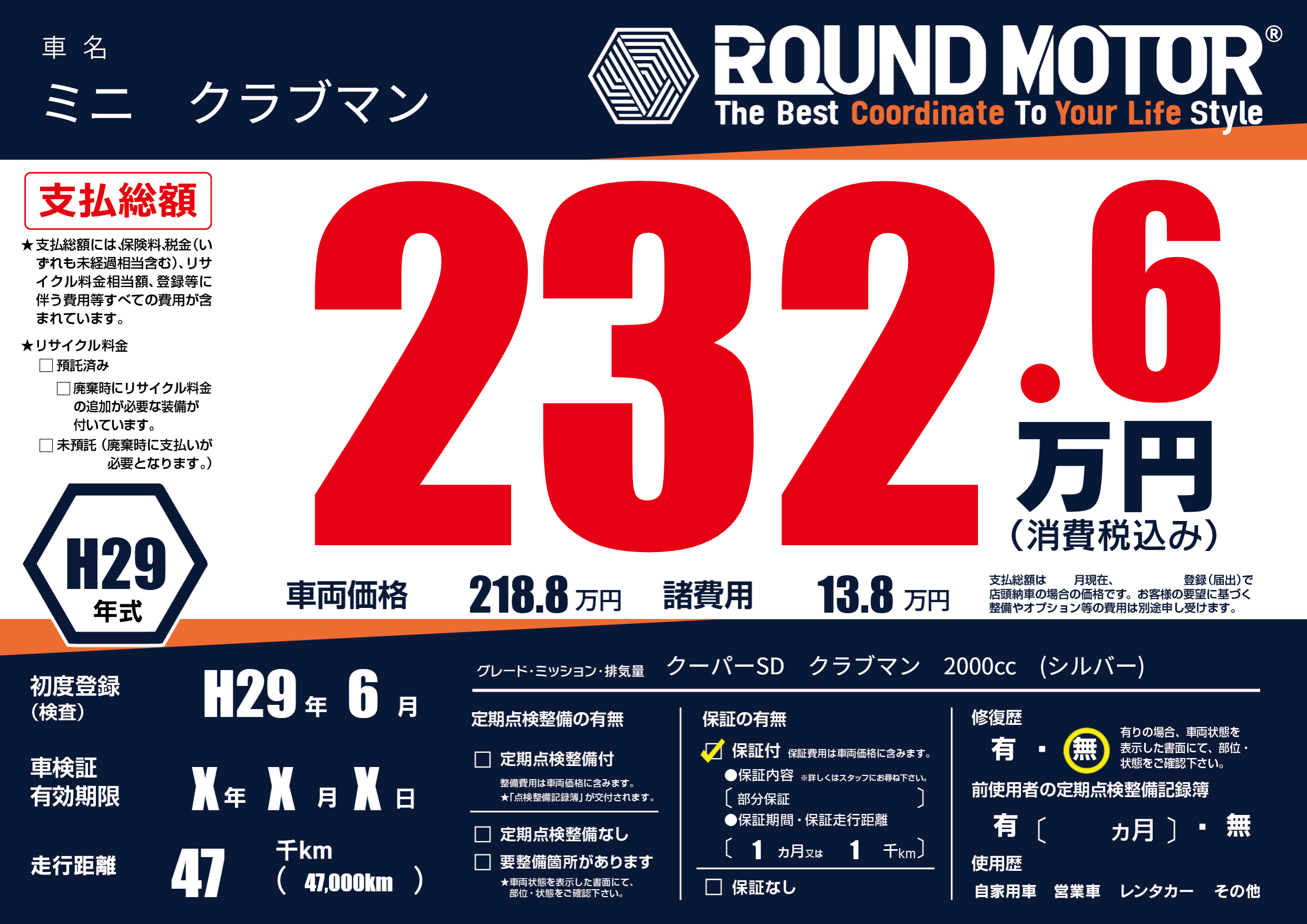 | 車名 | ミニ クラブマン | グレード ミッション 排気量 |