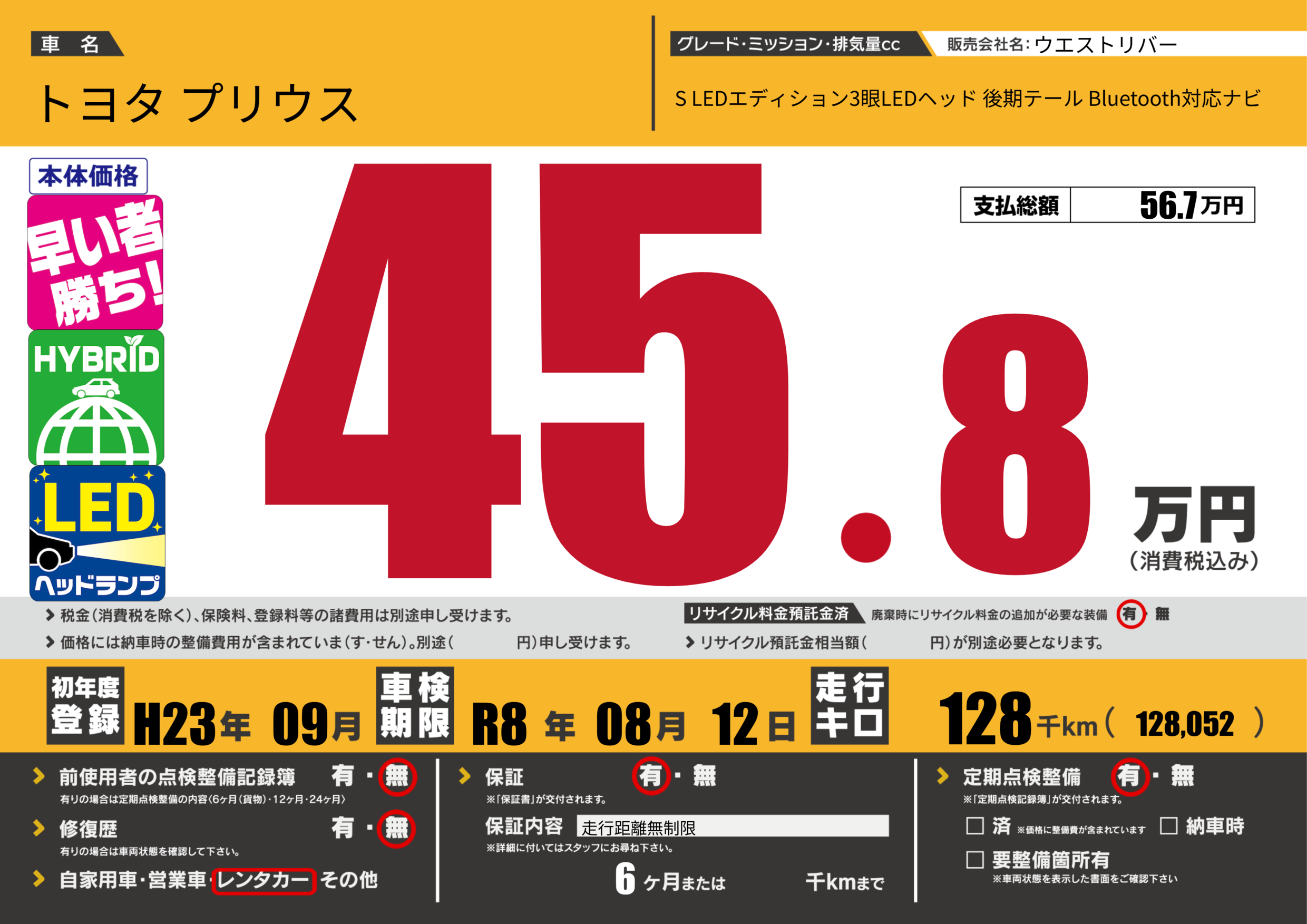| 車名 | トヨタ プリウス | グレード ミッション 排気量 |