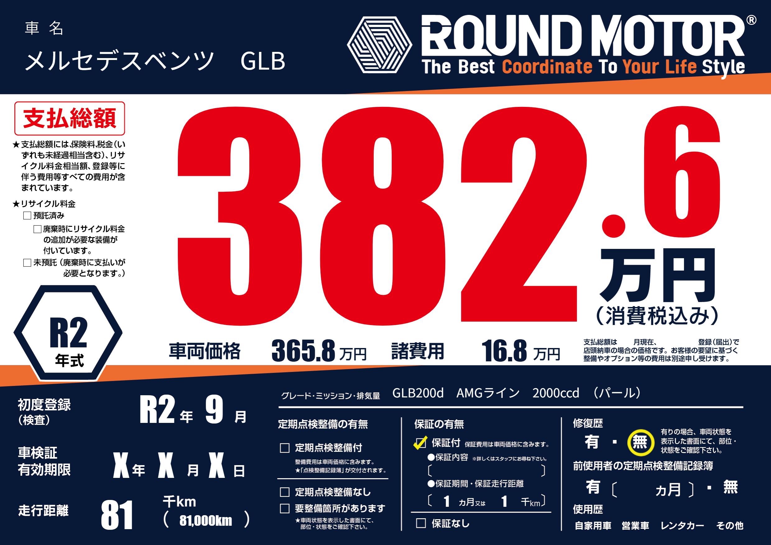 | 車名 | メルセデスベンツ GLB | グレード ミッション 排気量 |
