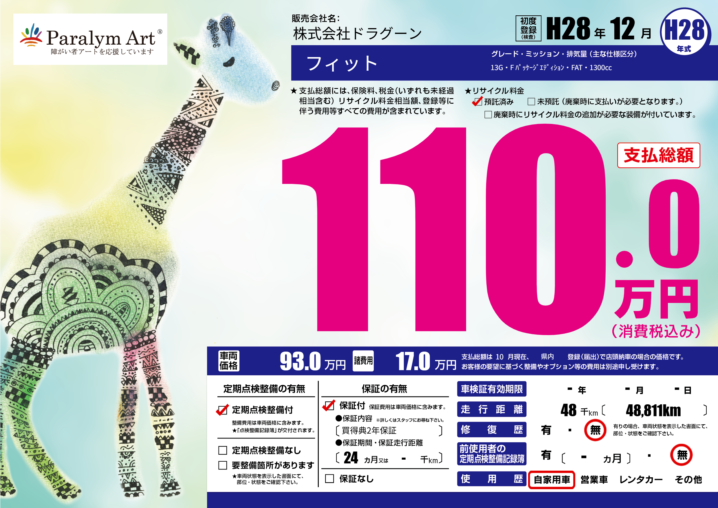 | 走行キロ | 4.8万km | 初年度登録 | H28年12月 |