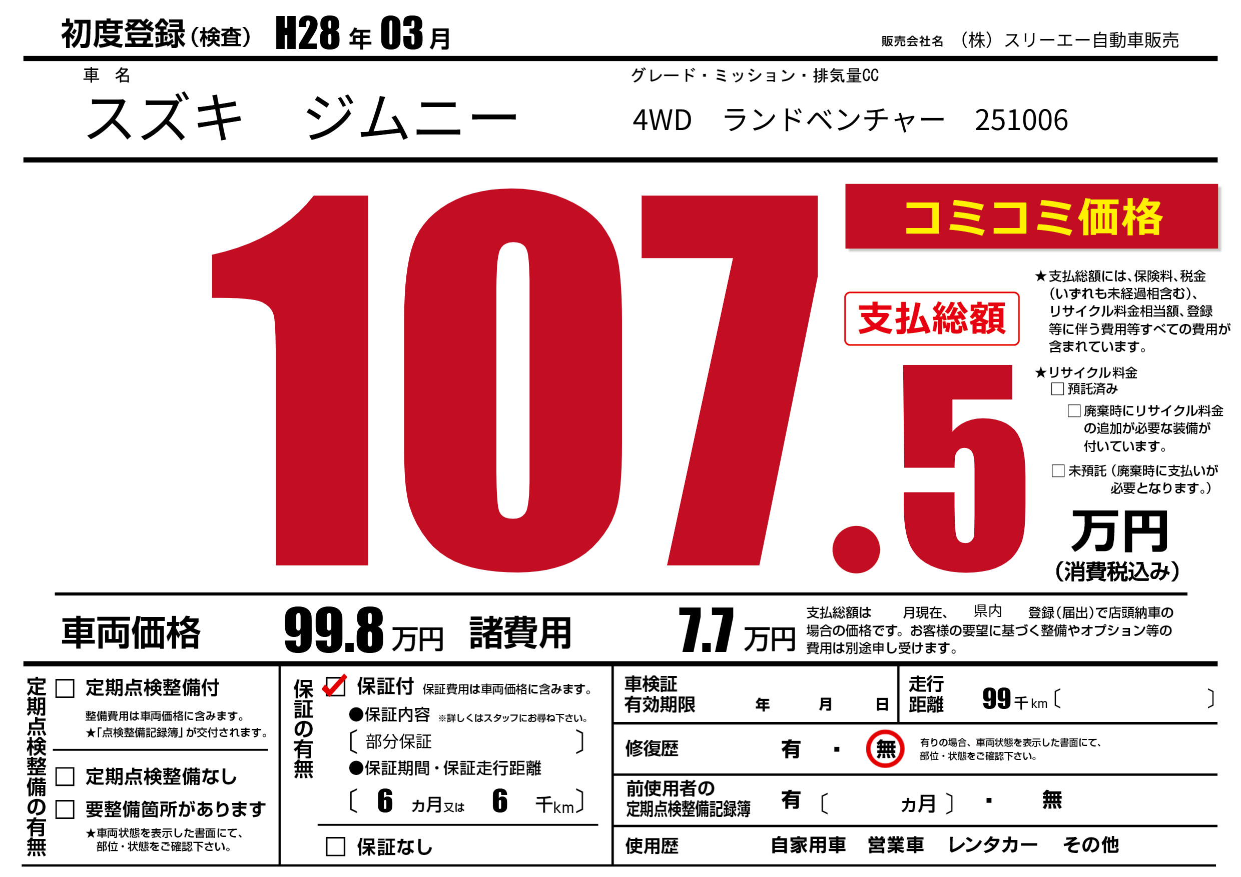 保証付き 保証内容(部分保証) 6ヶ月または(6)千kmまで |