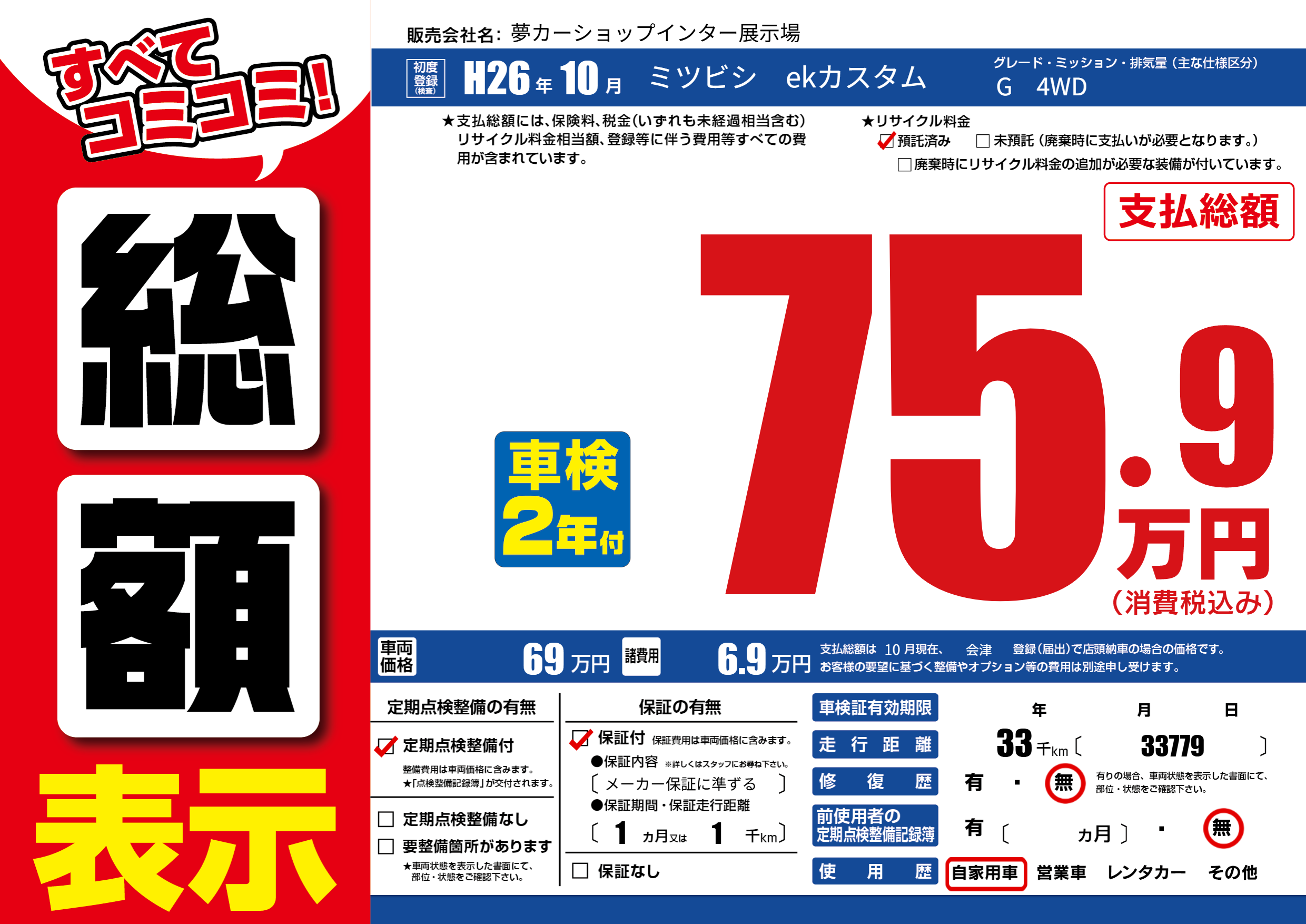 | 車名 | ミツビシ ekカスタム | グレード ミッション 排気量 |