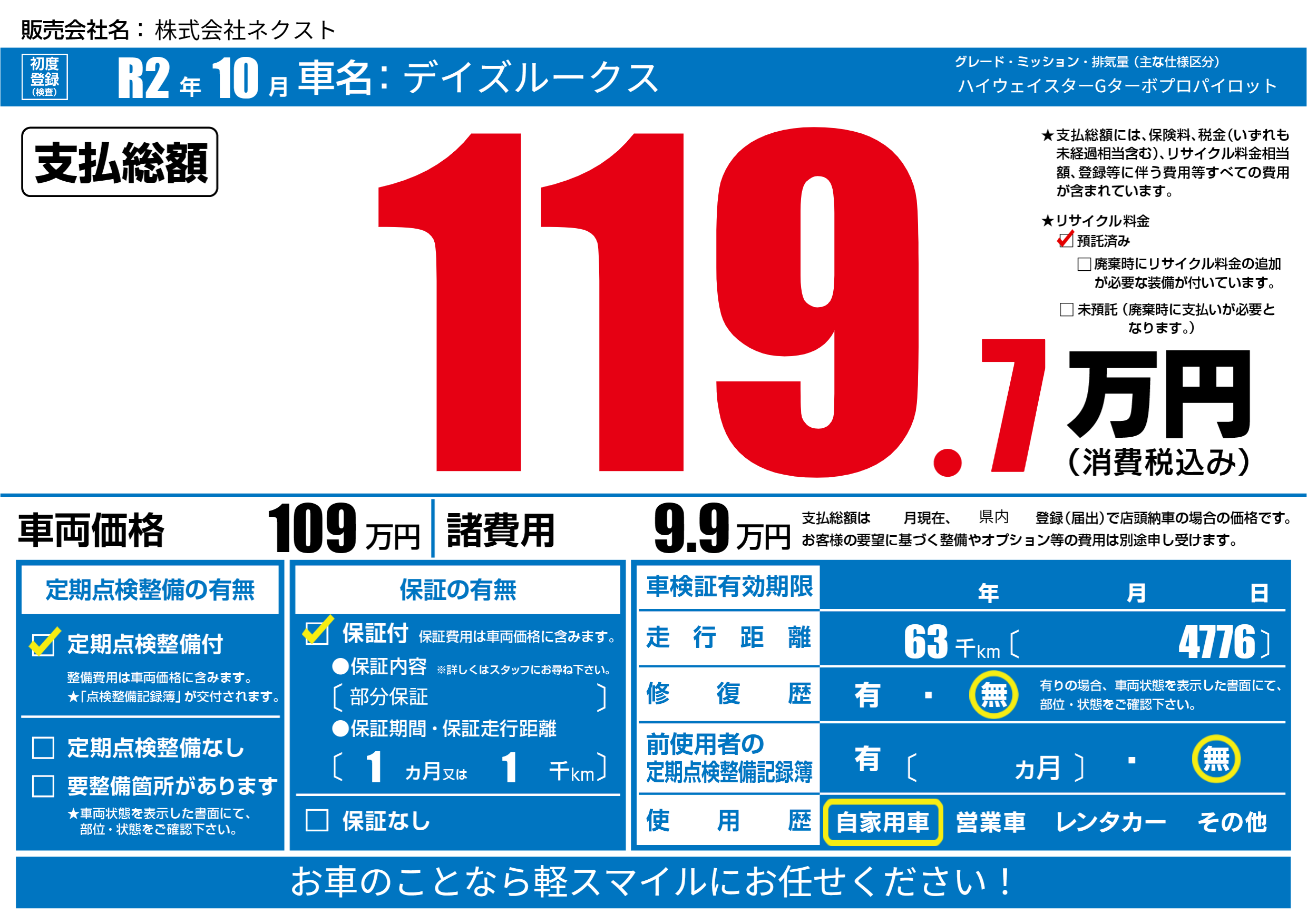 | 車名 | デイズルークス | グレード ミッション 排気量 |