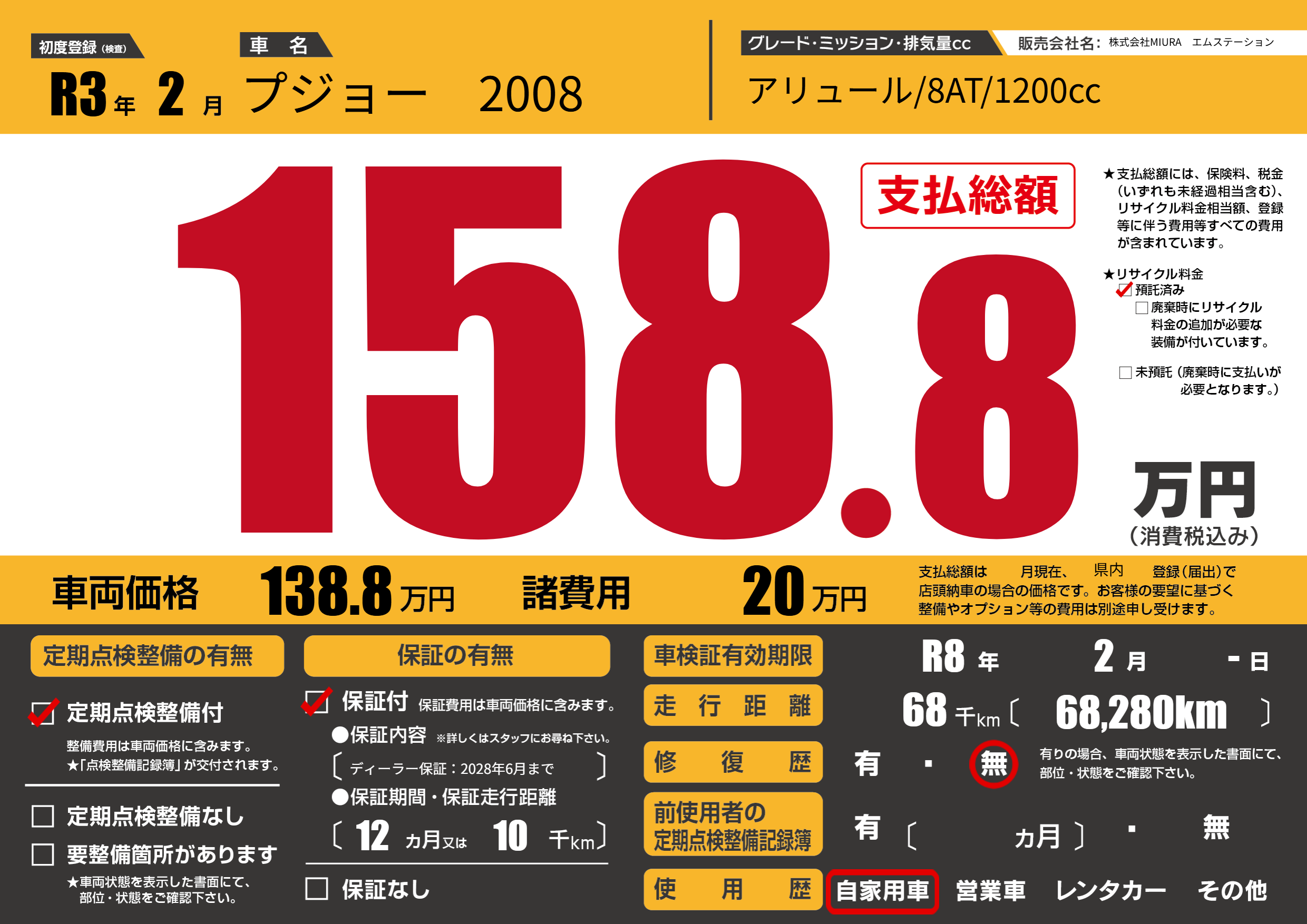 | 車名 | プジョー 2008 | グレード ミッション 排気量 |
