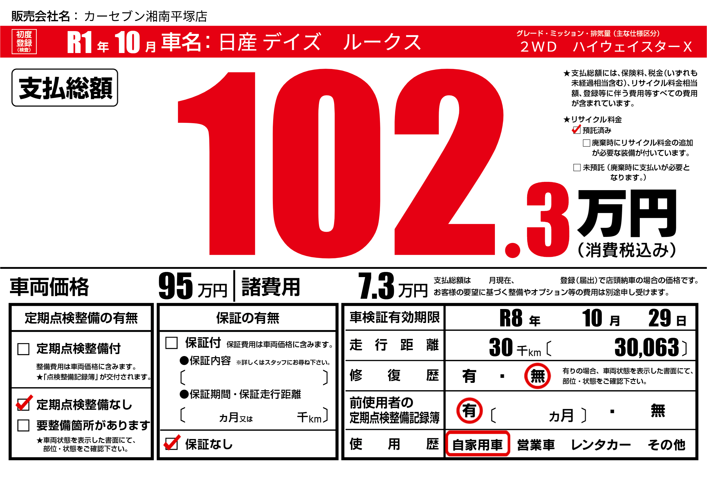 | 走行キロ | 3万km | 初年度登録 | R1年10月 |