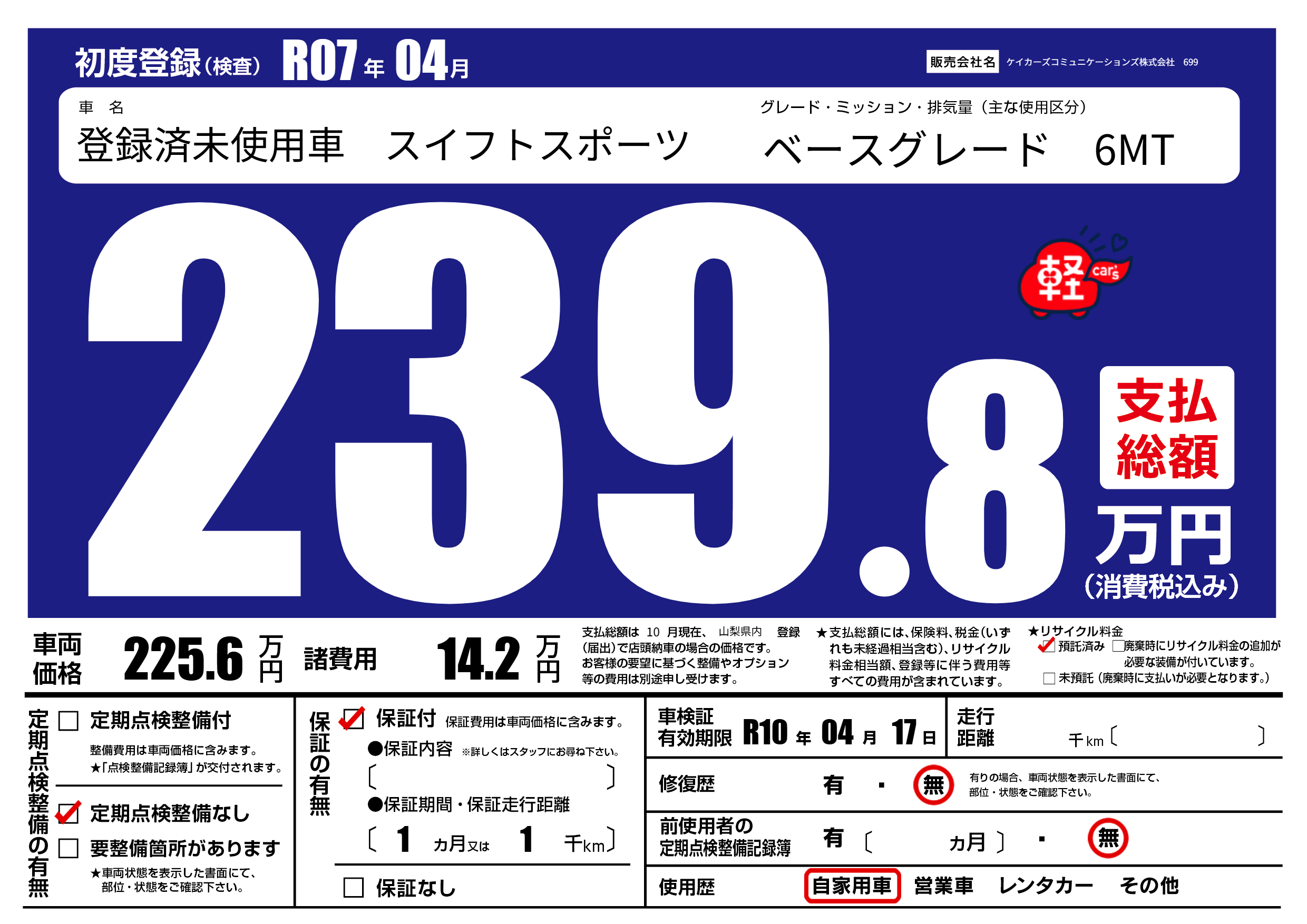 | 車名 | 登録済未使用車 スイフトスポーツ | グレード ミッション 排気量 |