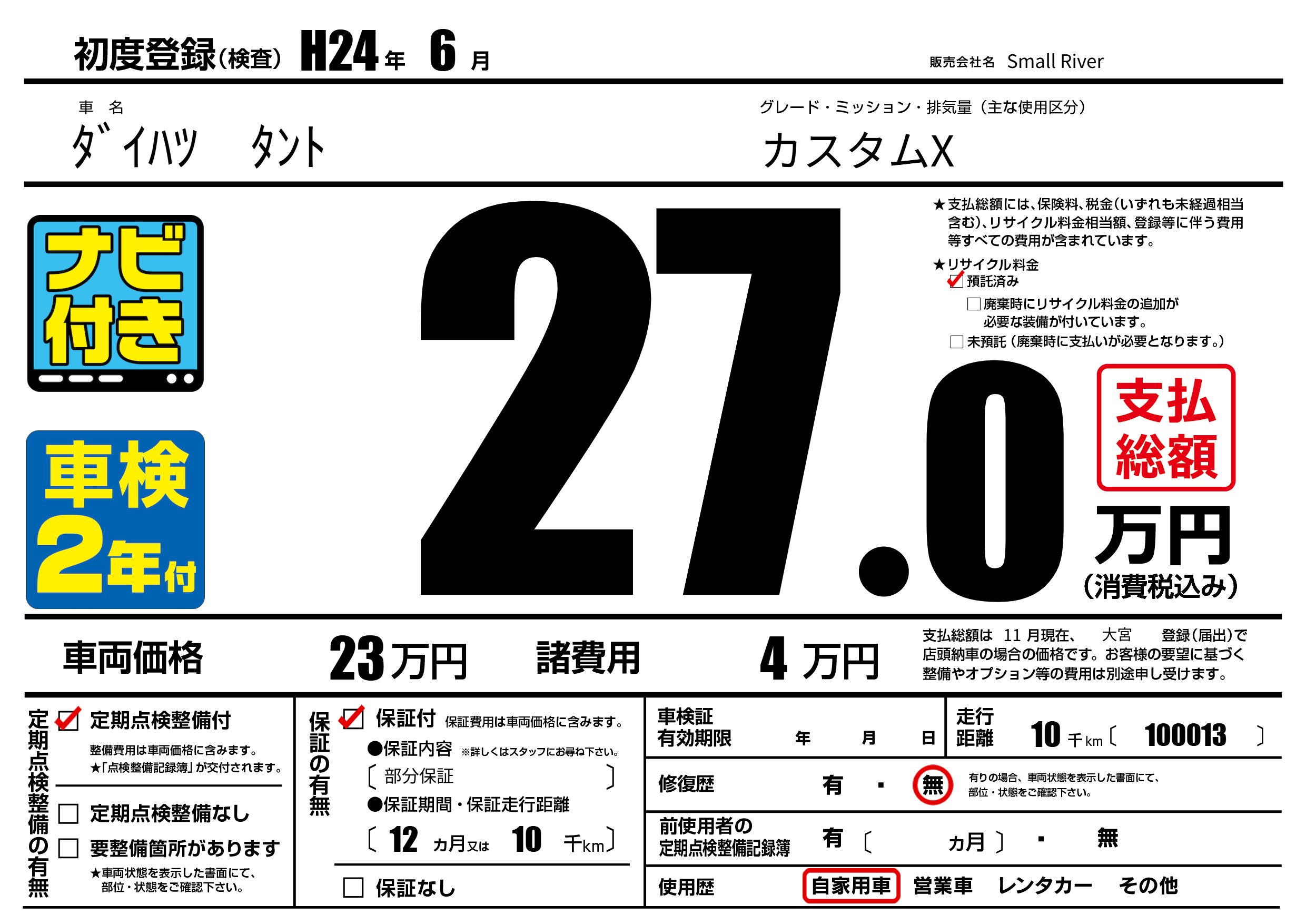 | 車名 | ダイハツ タント | グレード ミッション 排気量 |