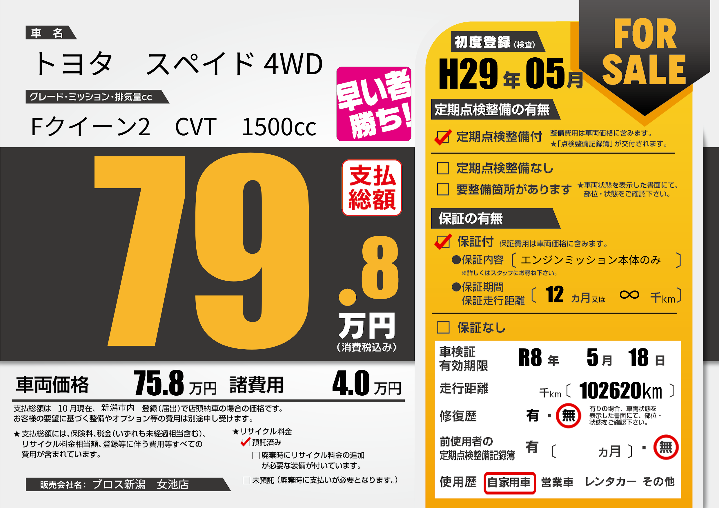 | 車名 | トヨタ スペイド 4WD | グレード ミッション 排気量 |