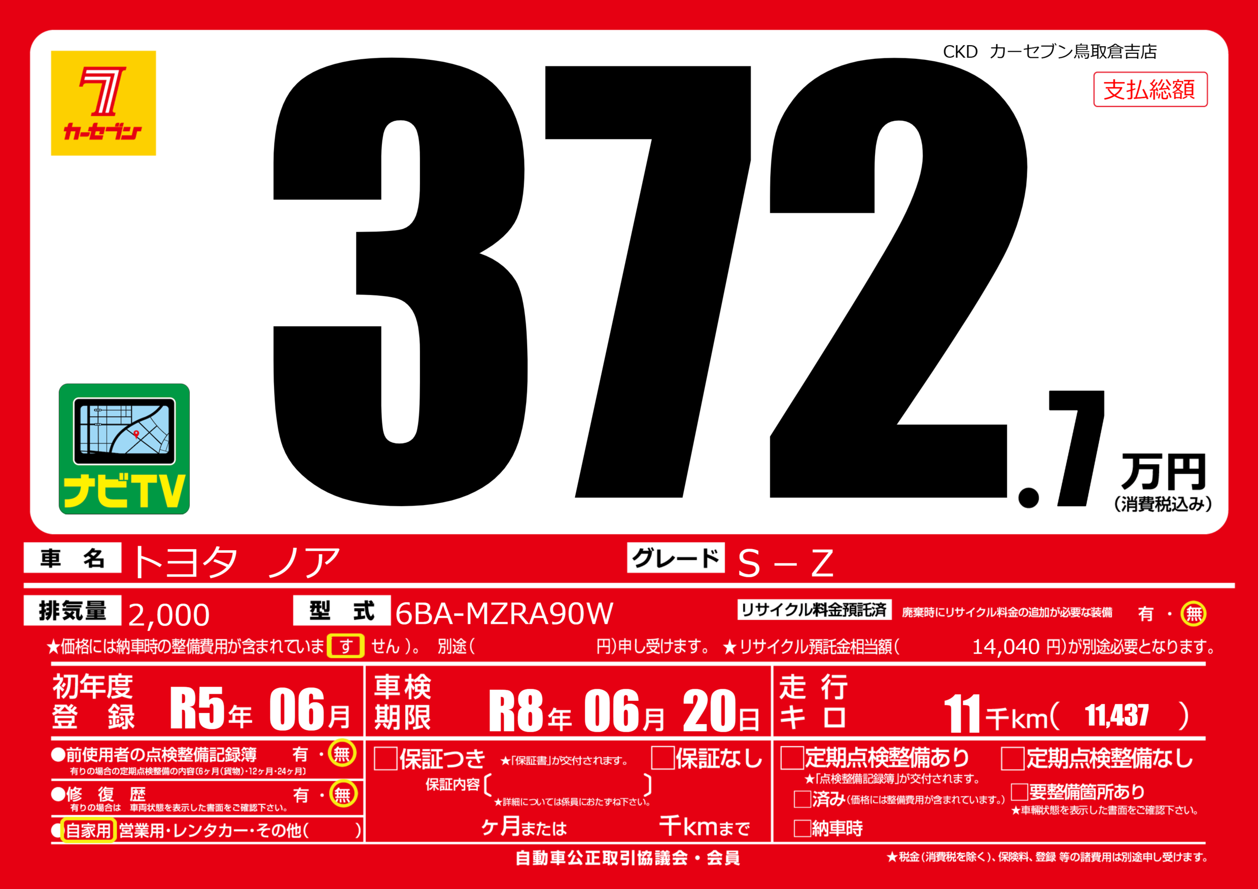 | 走行キロ | 1.1万km | 初年度登録 | R5年06月 |