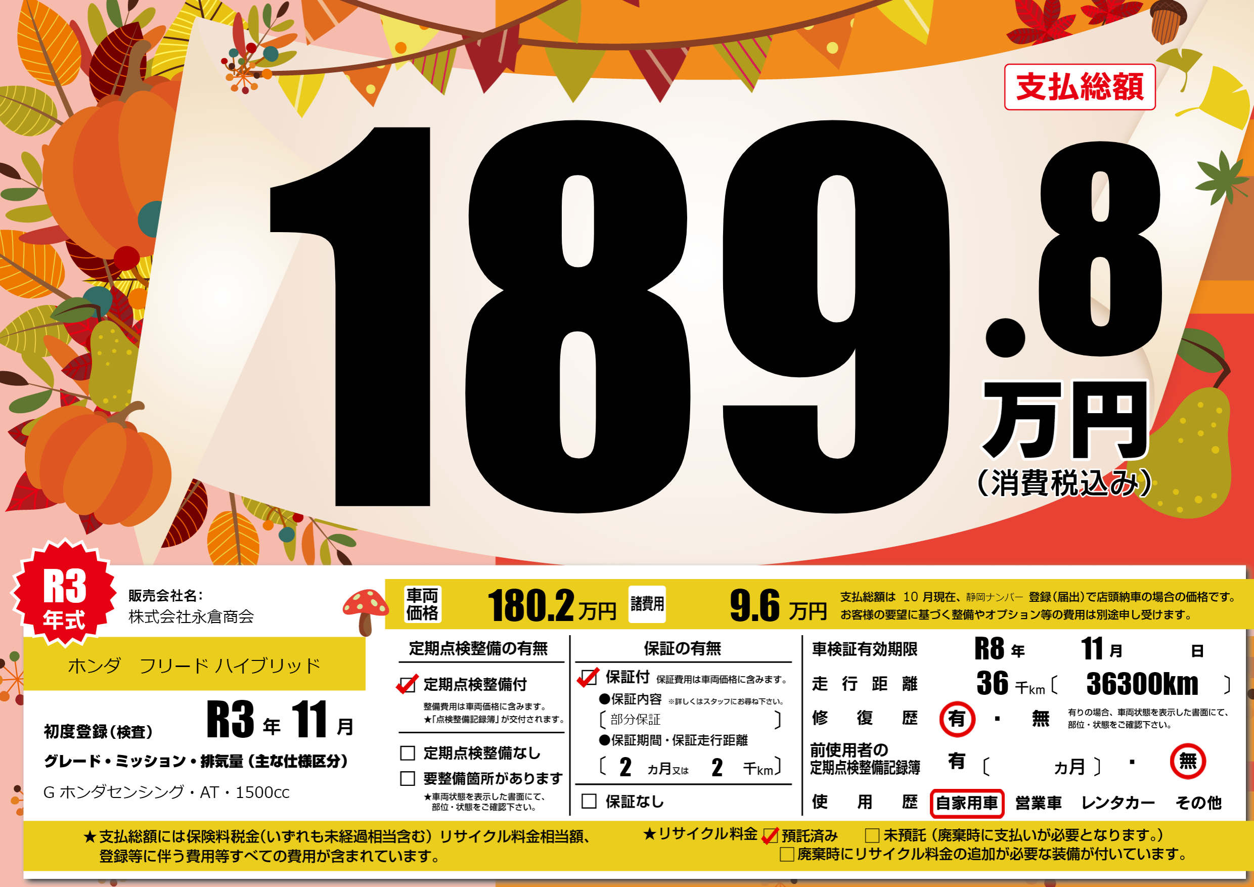 | 車名 | ホンダ フリード ハイブリッド | グレード ミッション 排気量 |