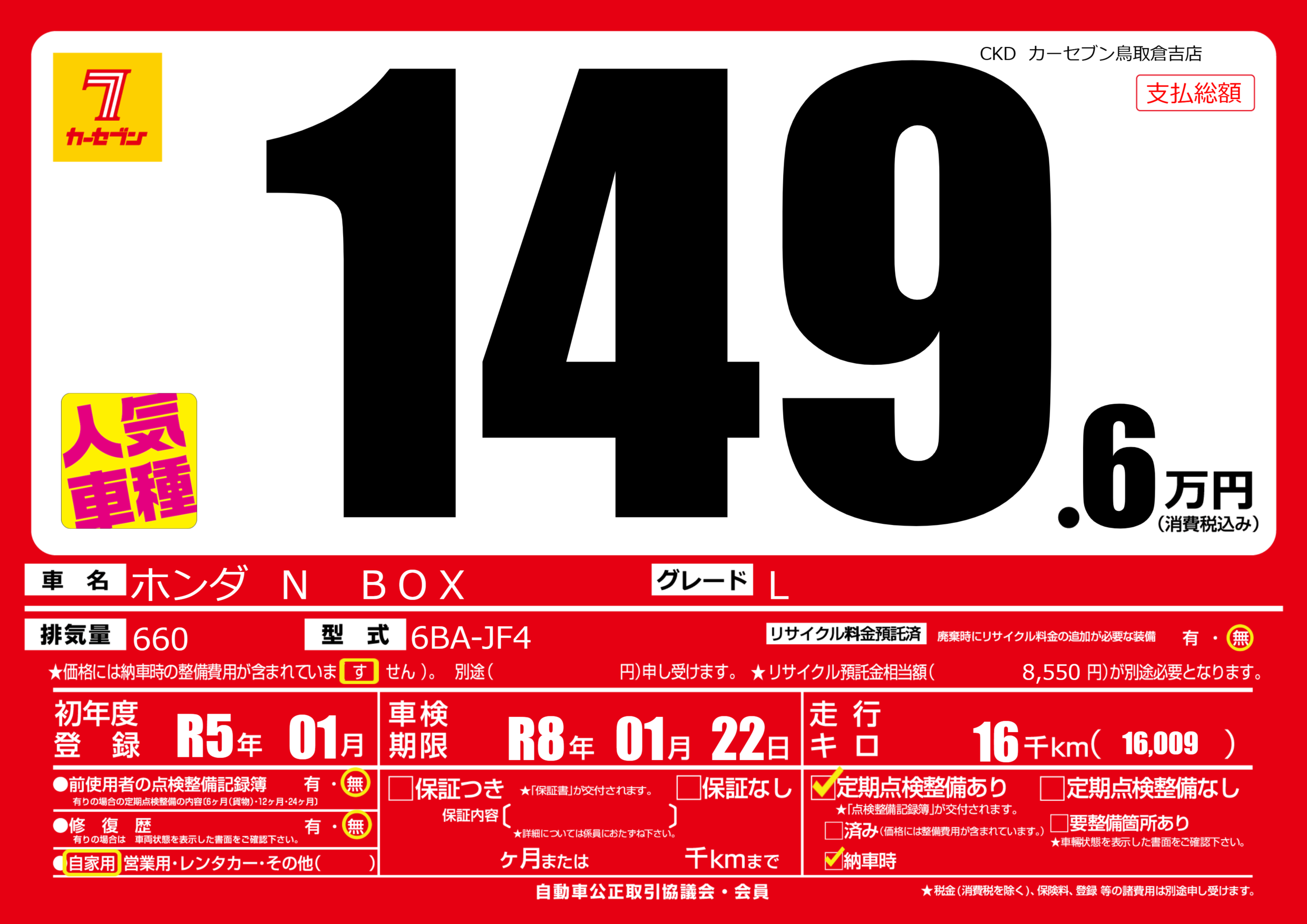 | 定期点検整備 | 定期点検整備あり 納車時あり | ||