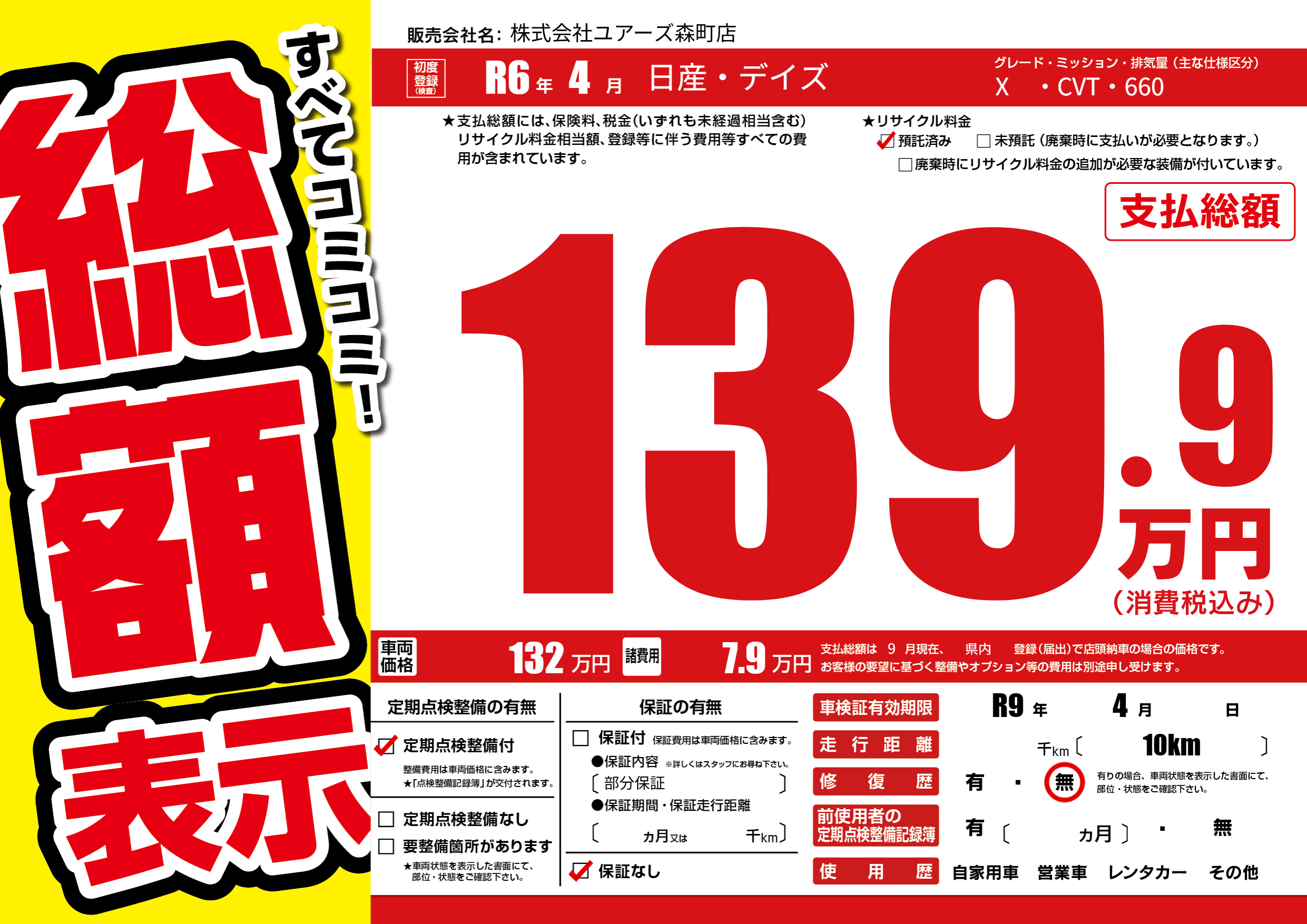 | 車名 | 日産・デイズ | グレード ミッション 排気量 |