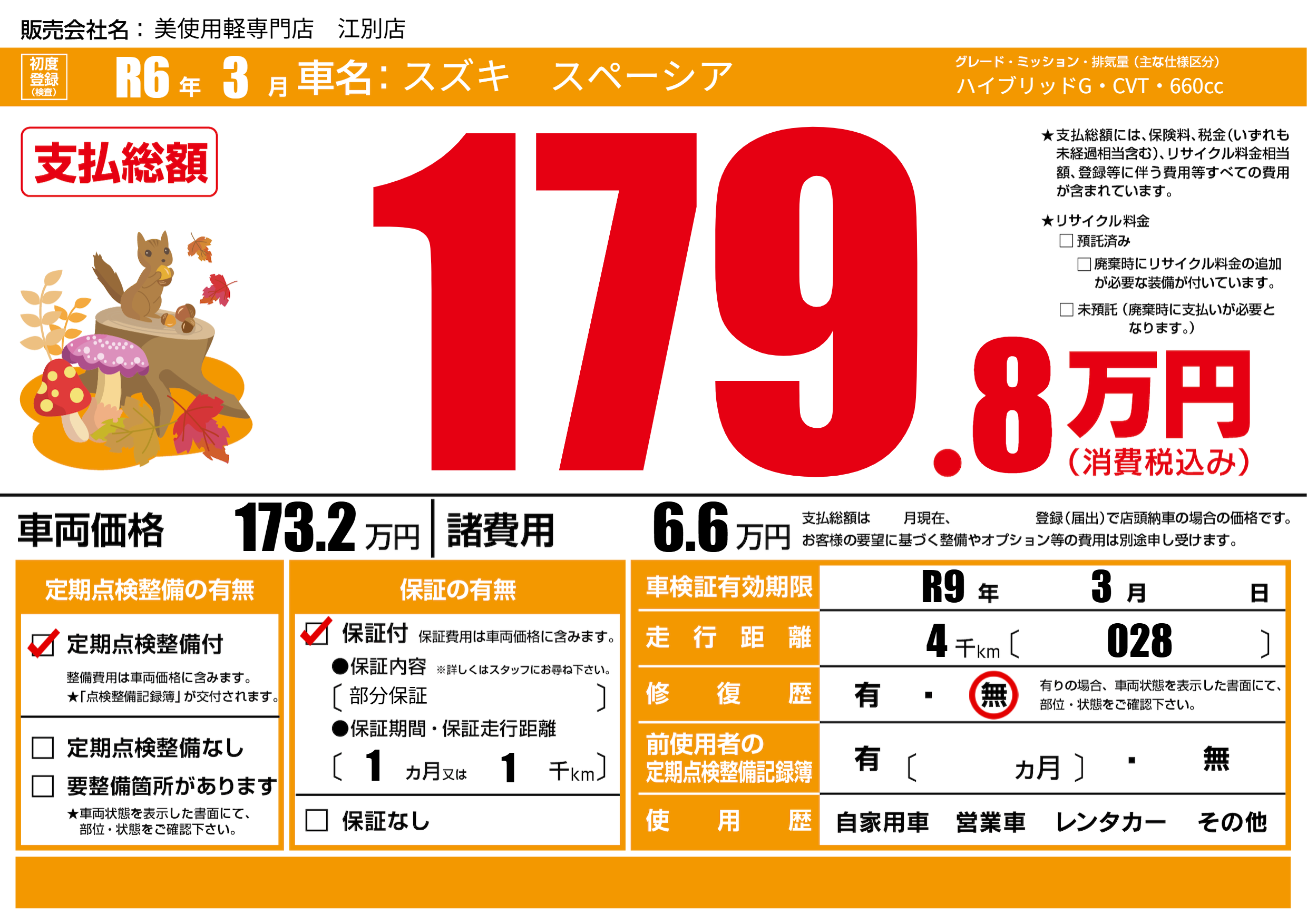なし | 車検制限 | R9年3月---月 |