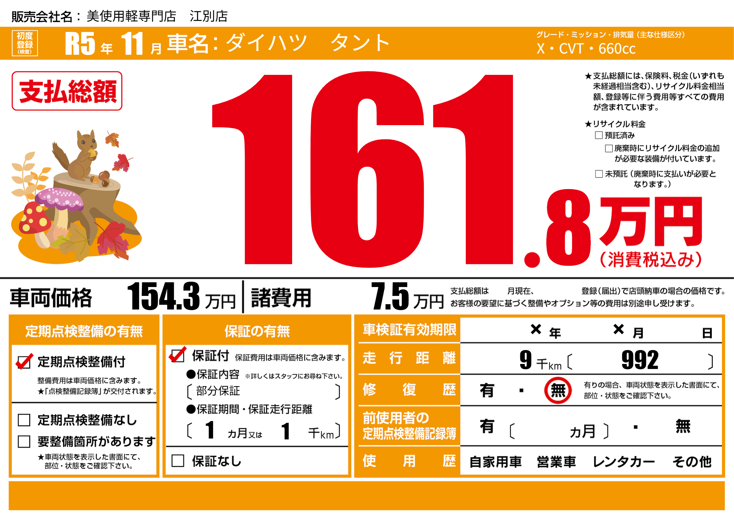 保証付き 保証内容(部分保証) 1ヶ月または(1)千kmまで |