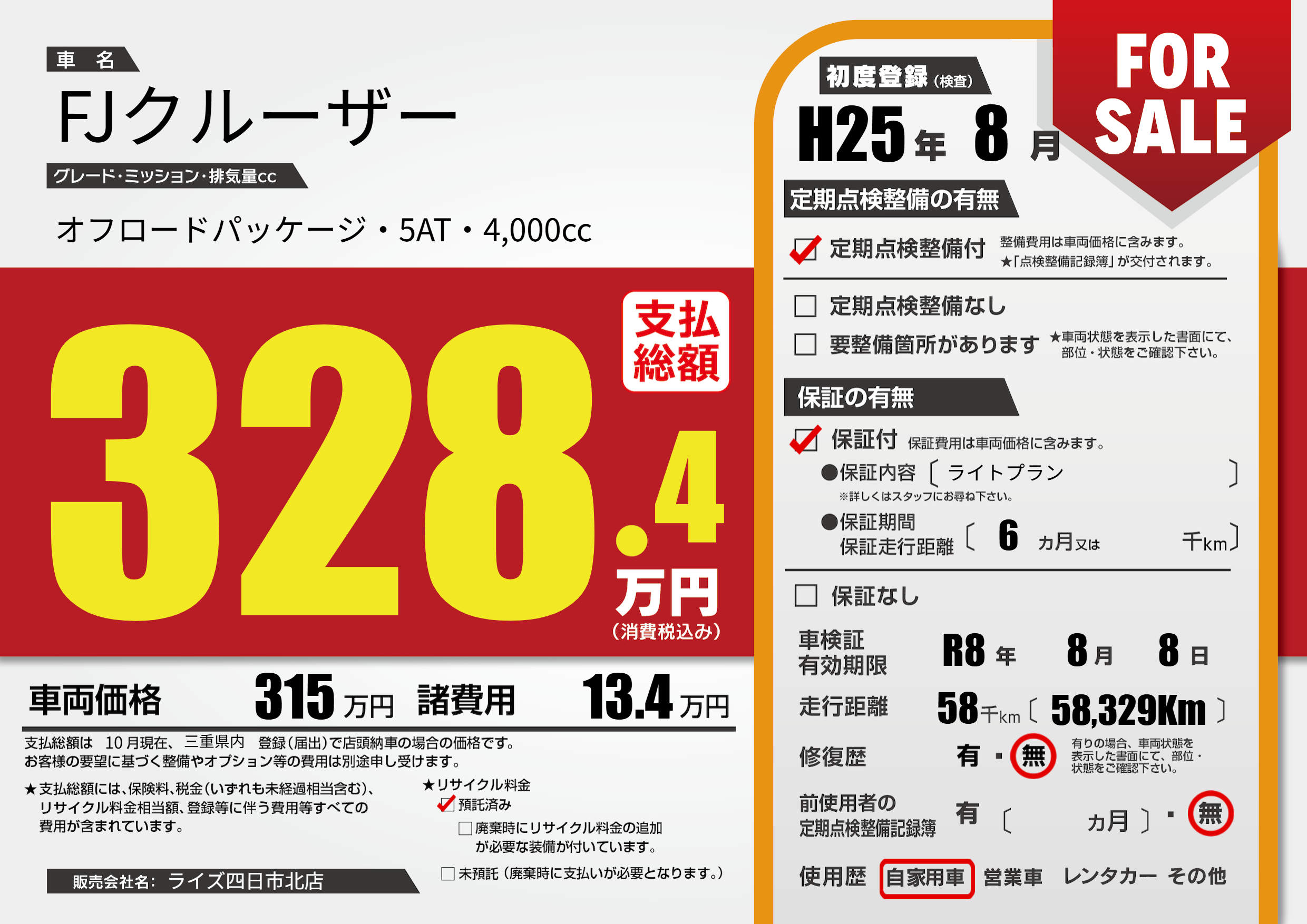 | 車名 | FJクルーザー | グレード ミッション 排気量 |