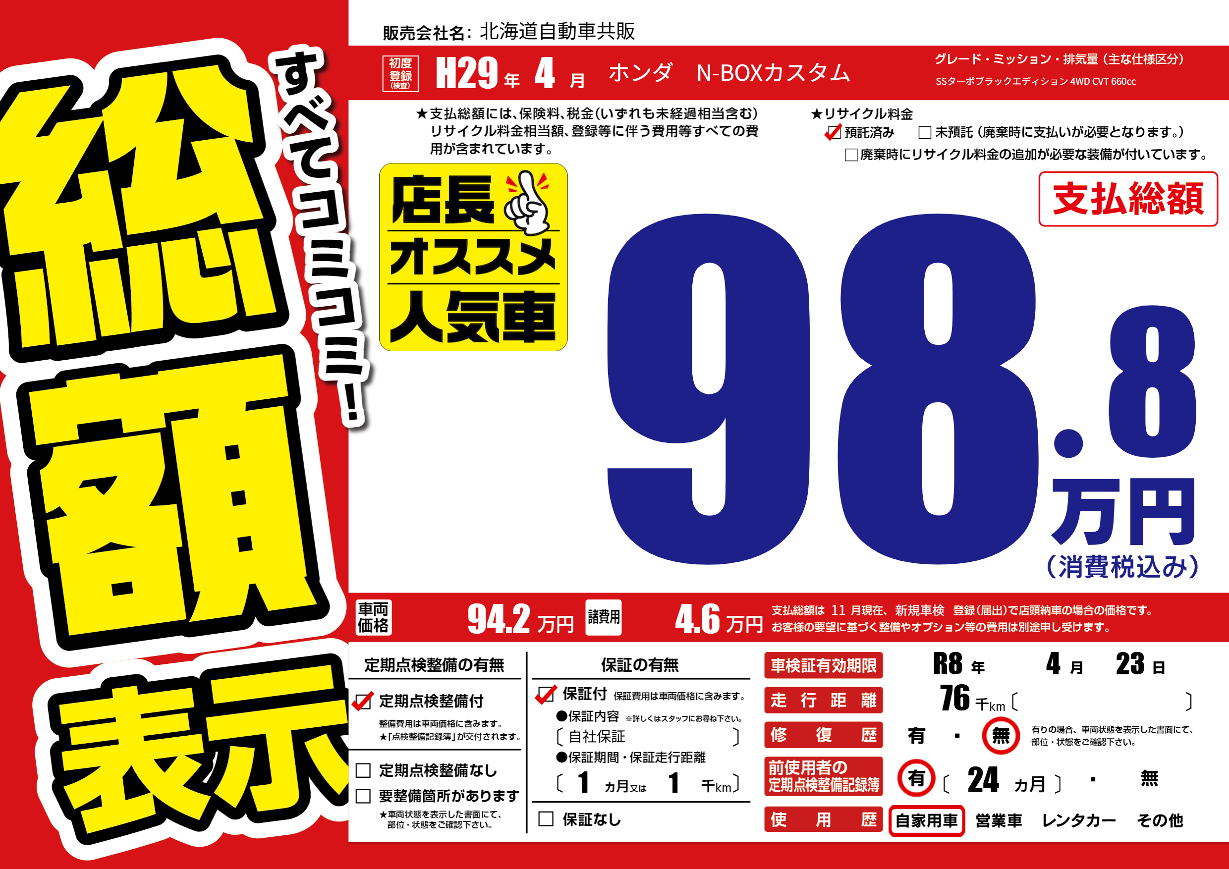 | 走行キロ | 7.6万km | 初年度登録 | H29年4月 |