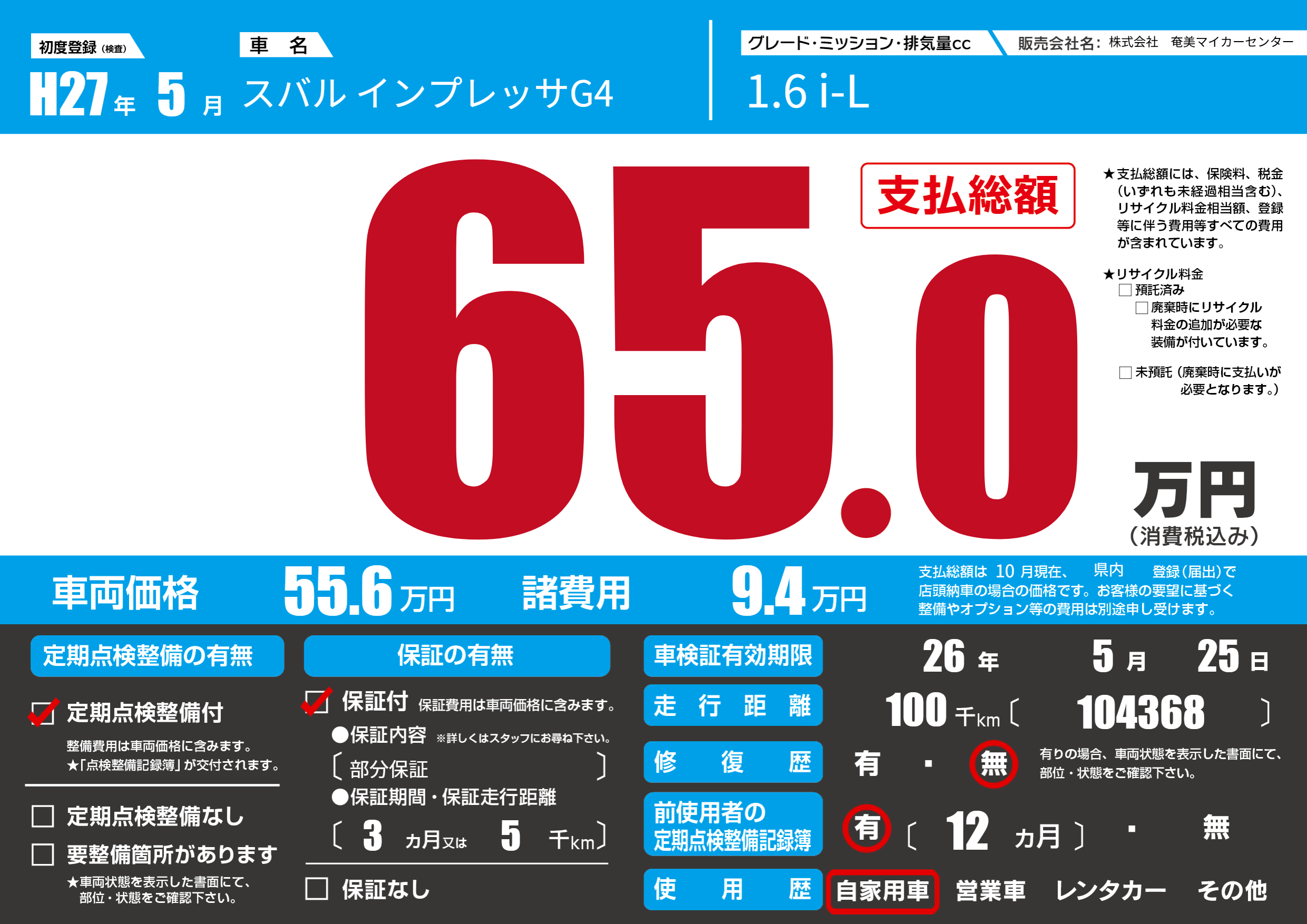 | 車名 | スバル インプレッサG4 | グレード ミッション 排気量 |