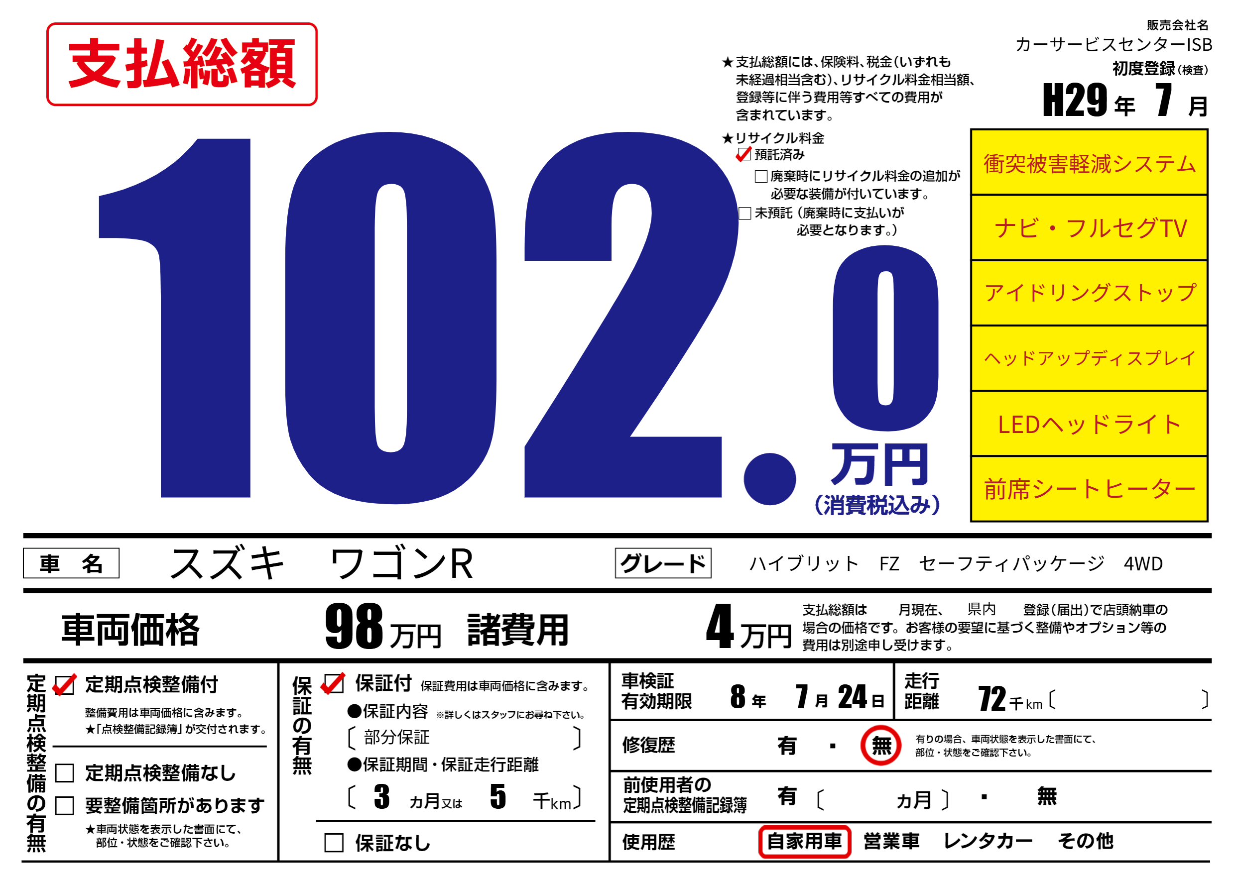 | 走行キロ | 7.2万km | 初年度登録 | H29年7月 |